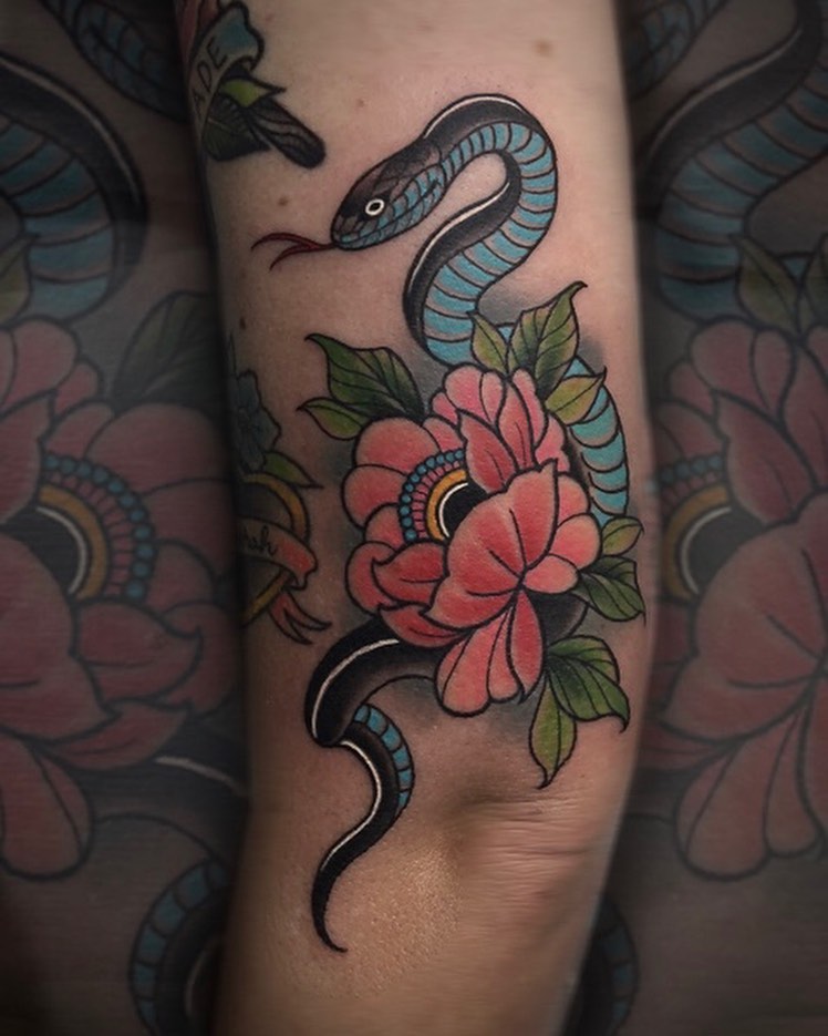 The intricate details of the snake’s scales and the soft petals of the flower blend seamlessly, showcasing the skillful use of color and line work.