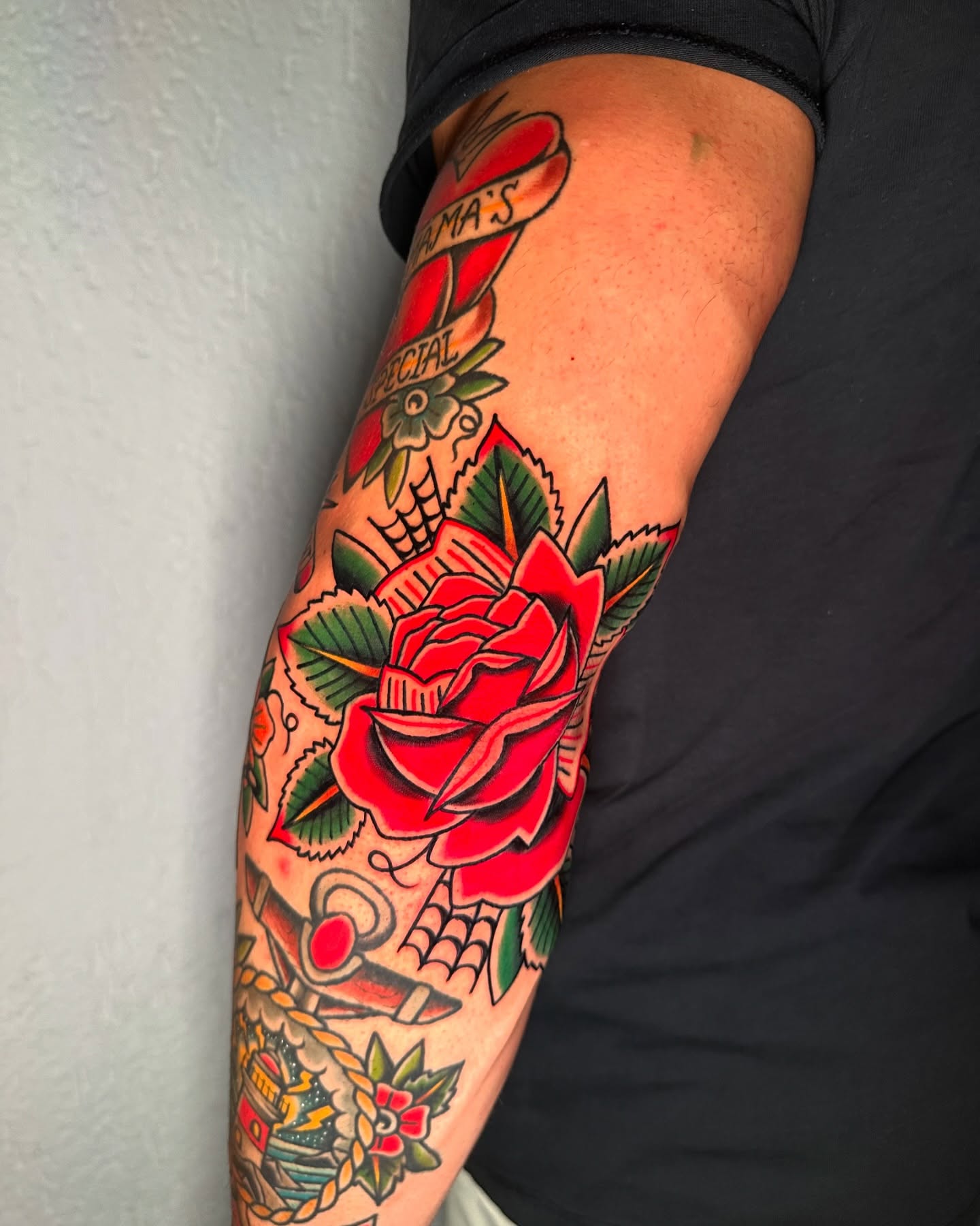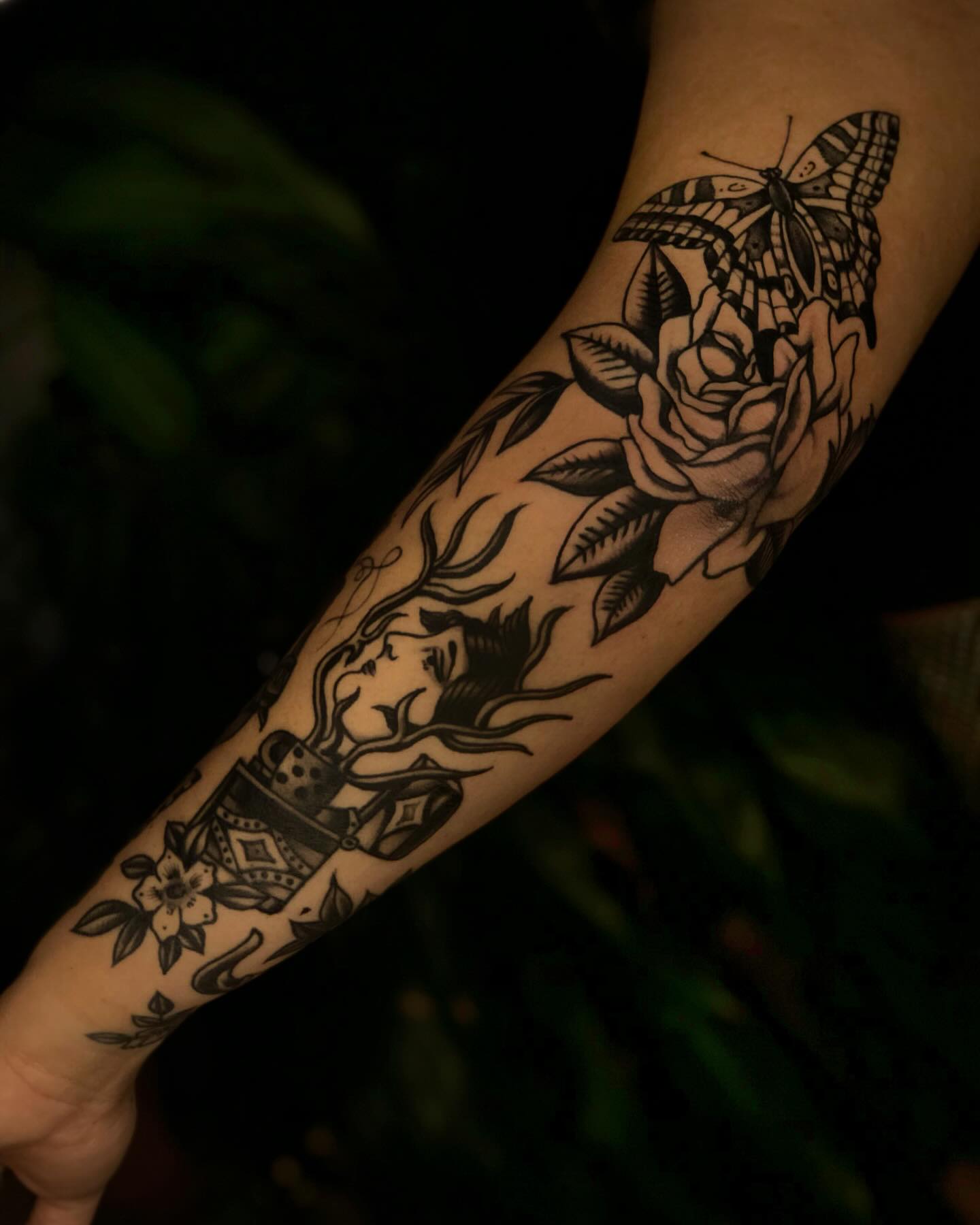 This tattoo features intricate designs of roses and a butterfly, creating a lively scene that wraps around the elbow.