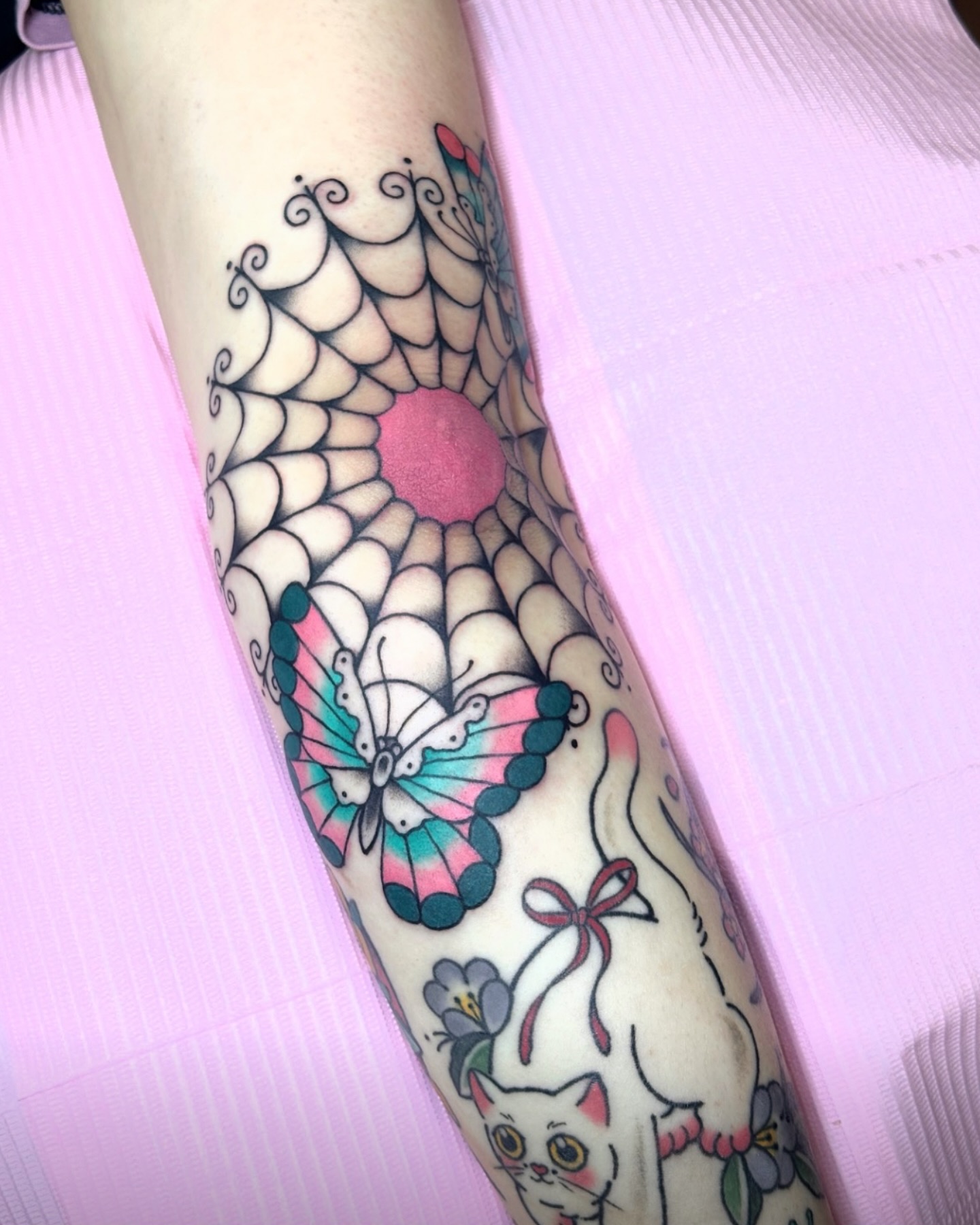 The tattoo features a detailed spiderweb design that surrounds a vibrant pink center, creating a striking focal point.