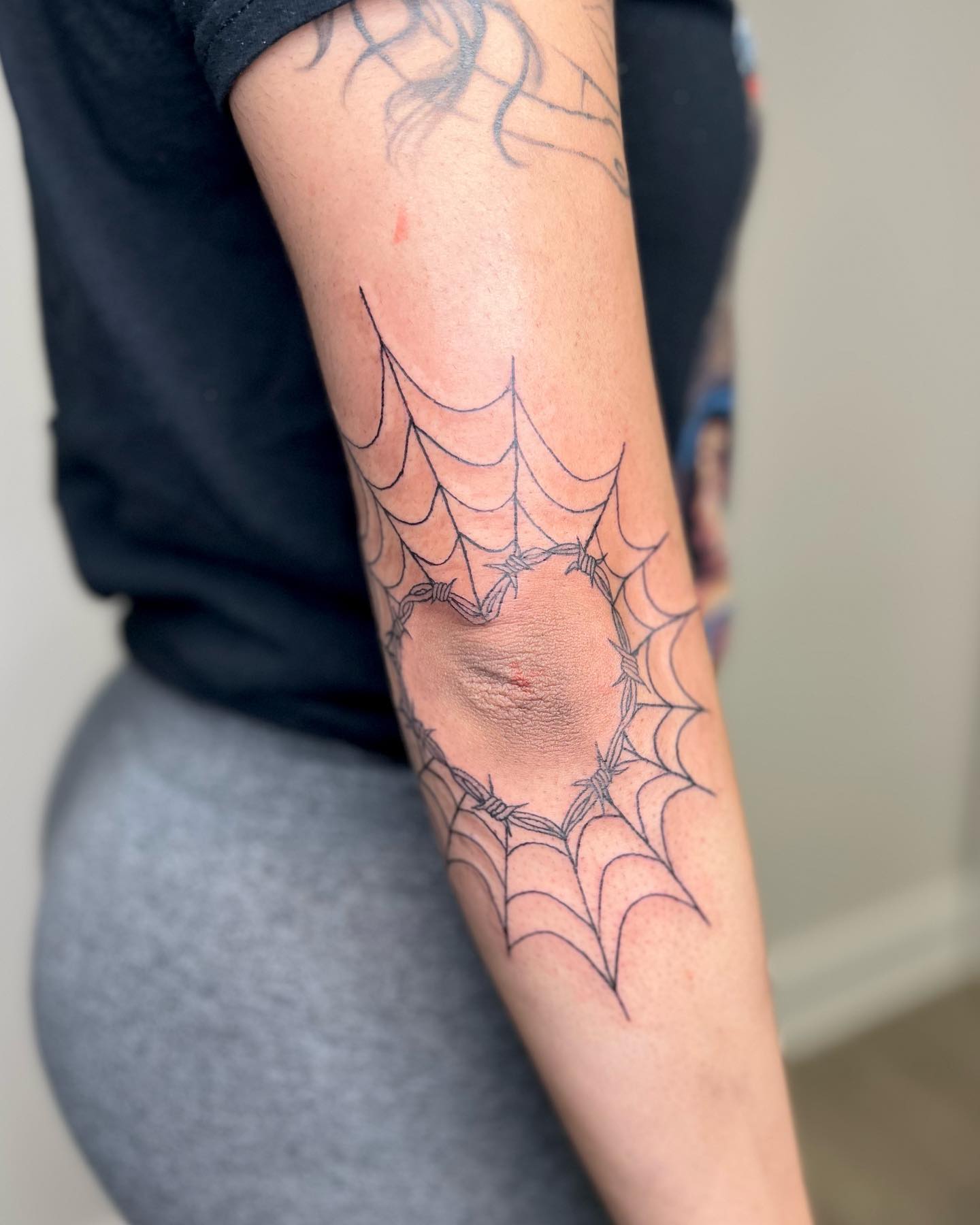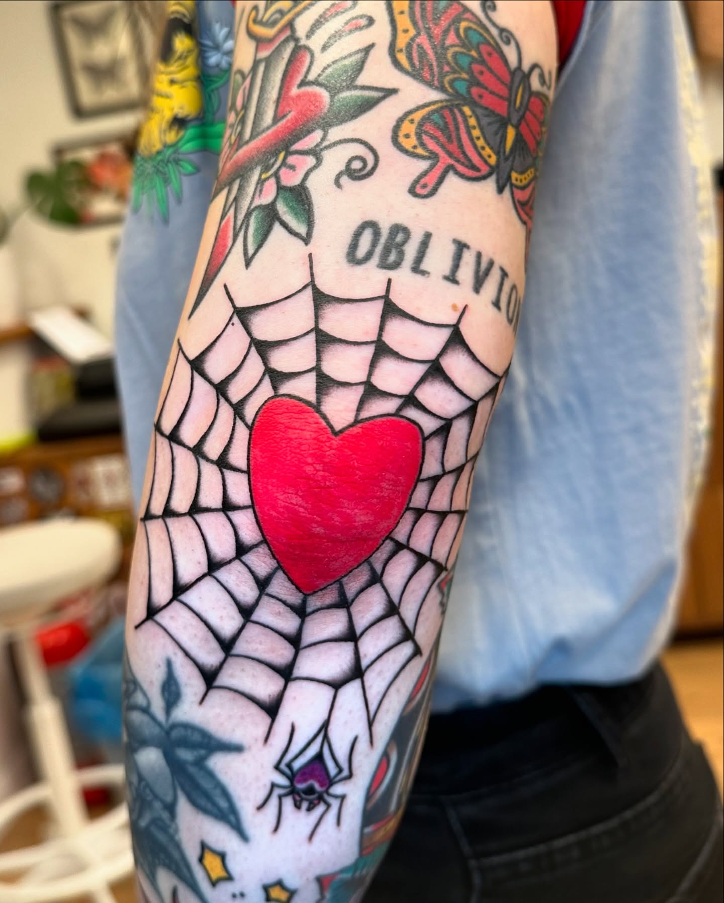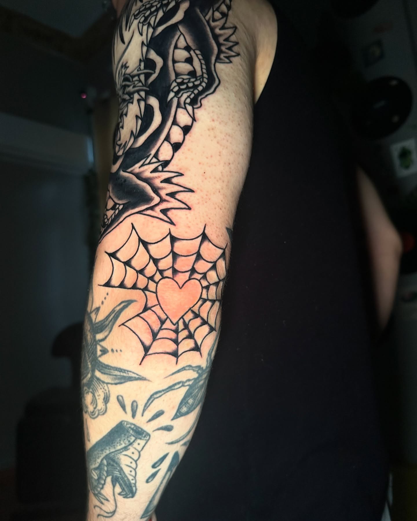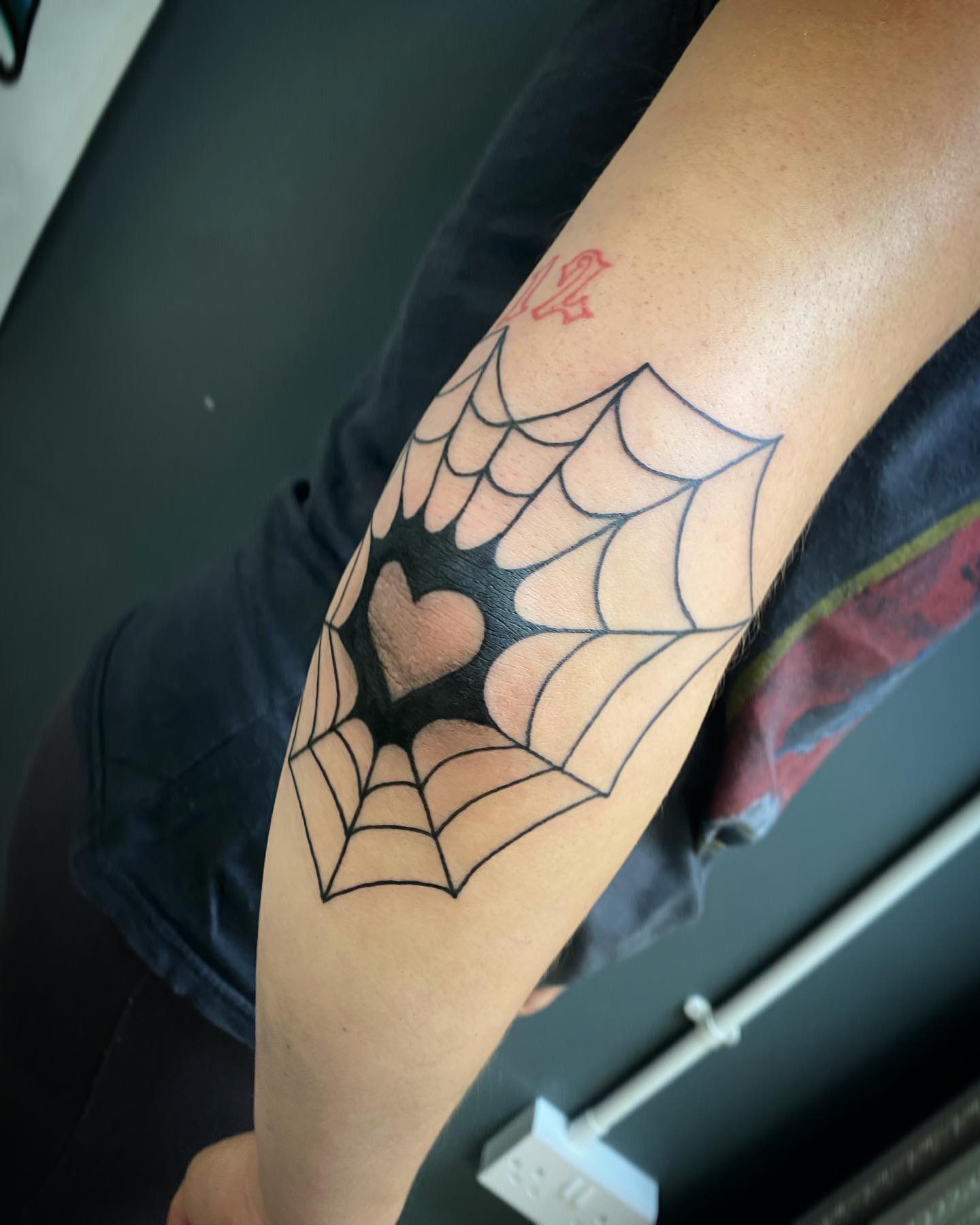 The tattoo features a spiderweb design prominently displayed on the elbow, accented by a heart-shaped cutout in the center.