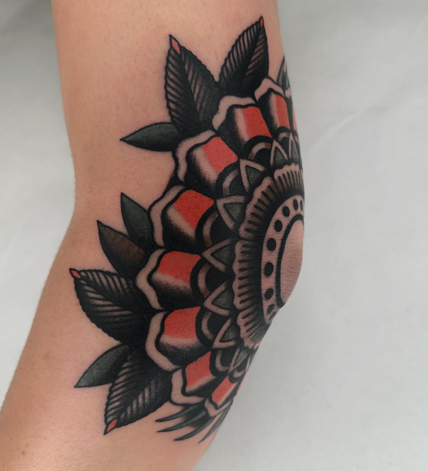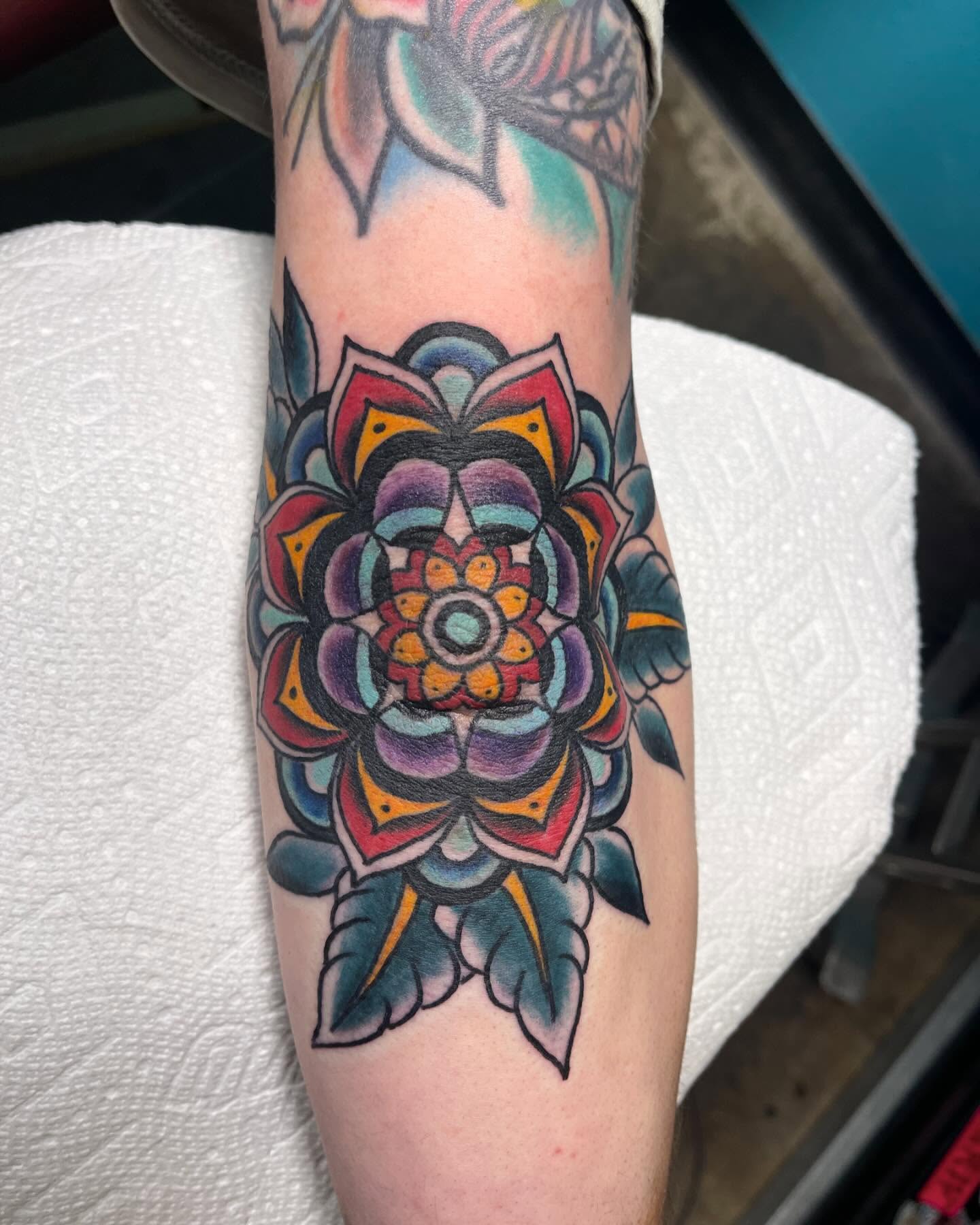 This elbow tattoo features a striking mandala design surrounded by vibrant petals and detailed leaves.