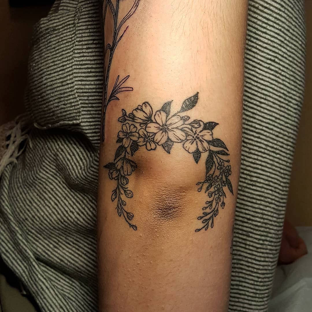 The tattoo features a delicate arrangement of flowers encircling the elbow, creating a soft and flowing look.