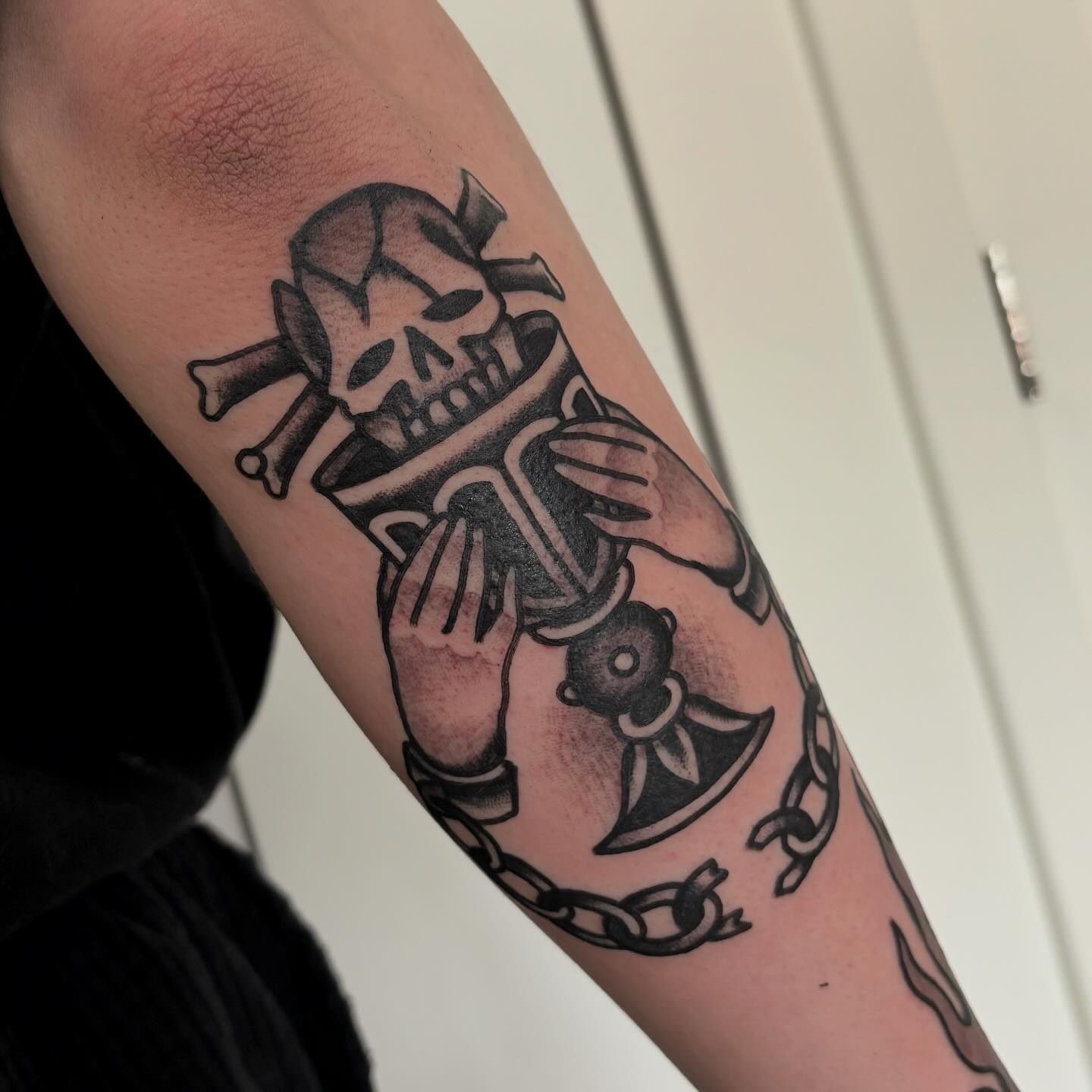 This tattoo would be ideal for fans of gaming or fantasy themes, as it combines personal passion with artistic expression.