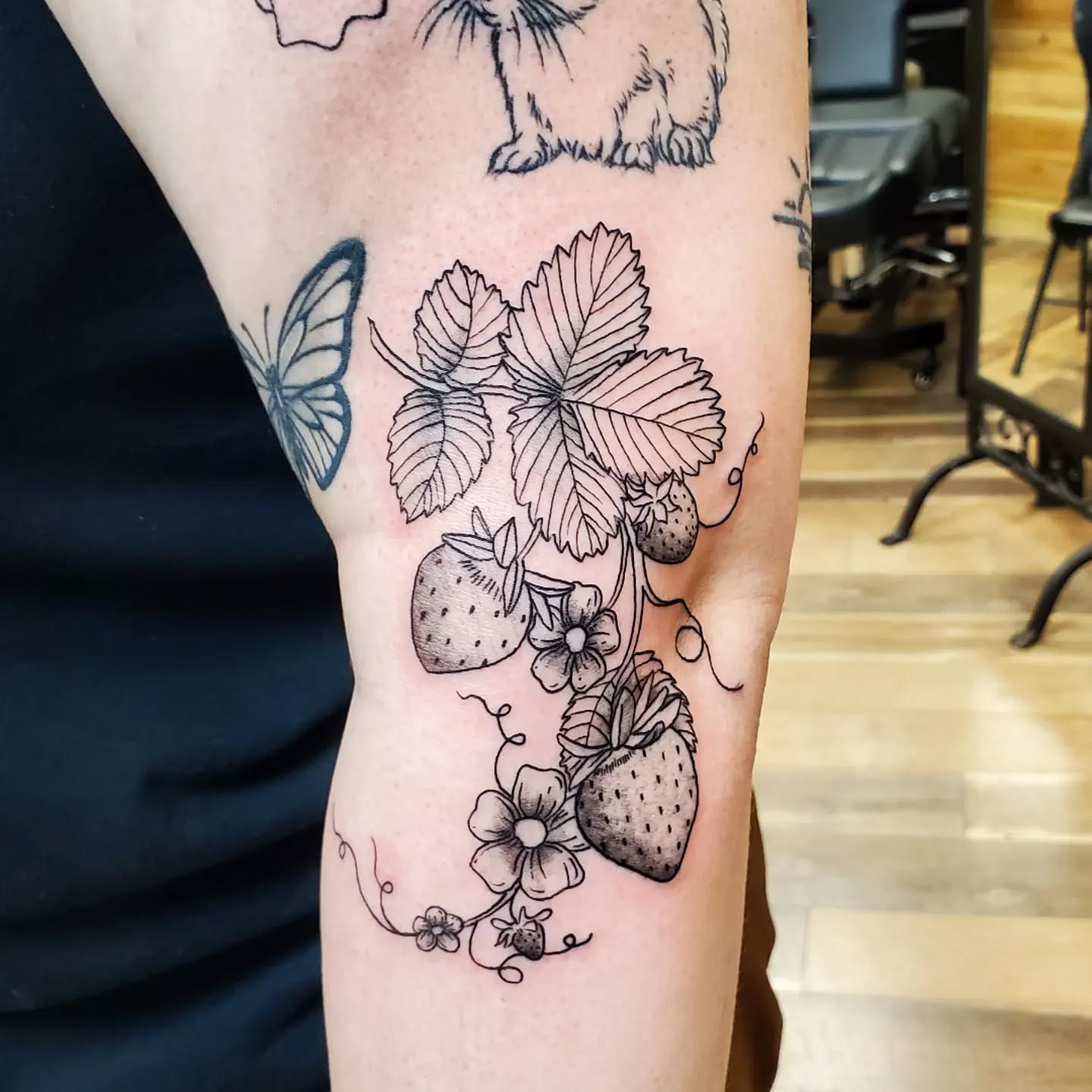 The tattoo features a detailed design of strawberry plants, complete with leaves, flowers, and ripe strawberries.
