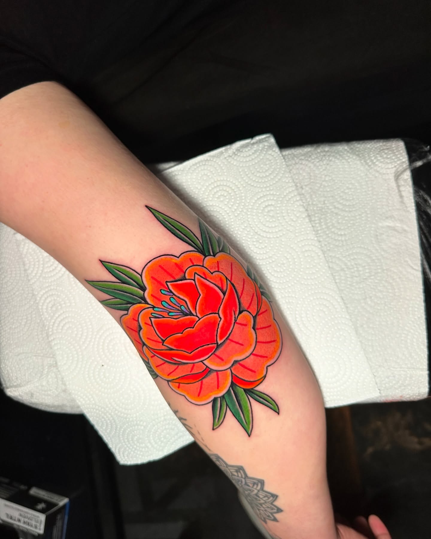 The combination of bold reds, pinks, and greens creates a lively contrast against the skin, while the careful shading enhances the flower’s depth and shape.