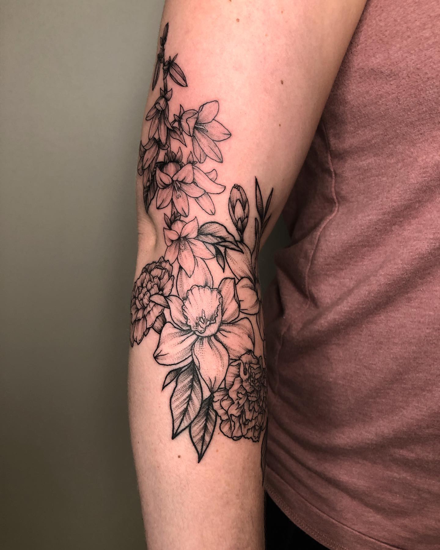 Each floral element is carefully arranged to create a cohesive design that flows beautifully around the elbow area.