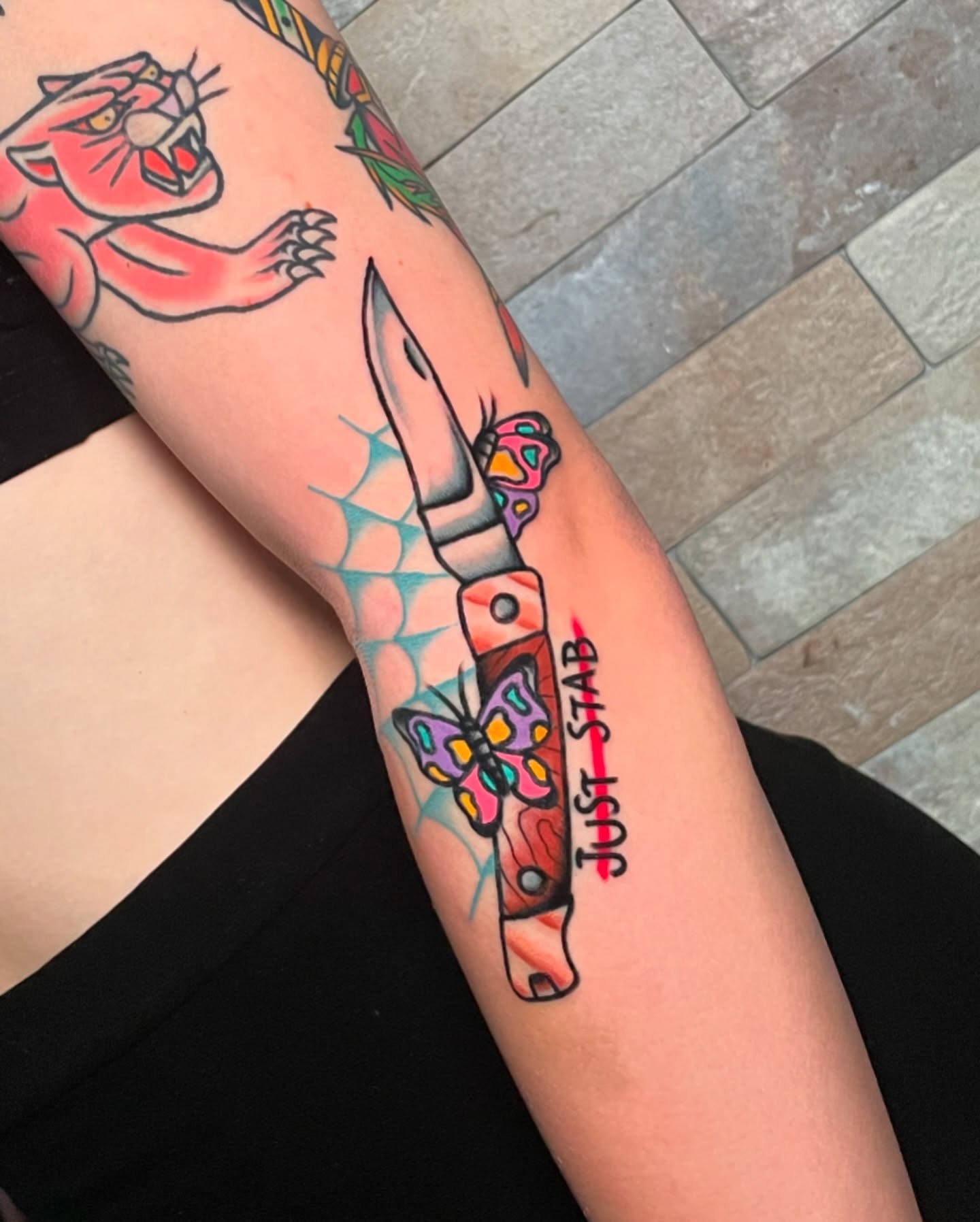 The tattoo features a striking knife design accompanied by a colorful butterfly, creating a bold visual contrast.