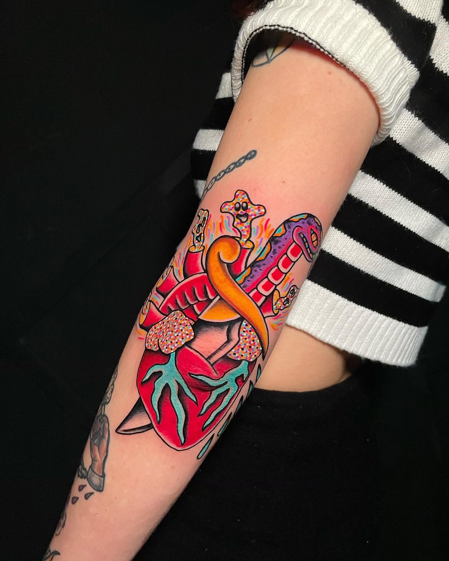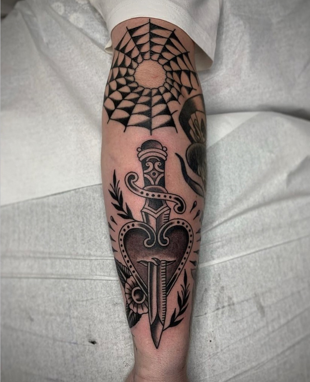 The tattoo features a striking heart and dagger design, complemented by an intricate spiderweb above.