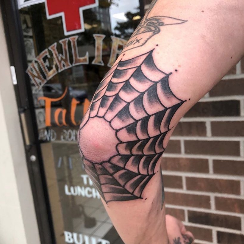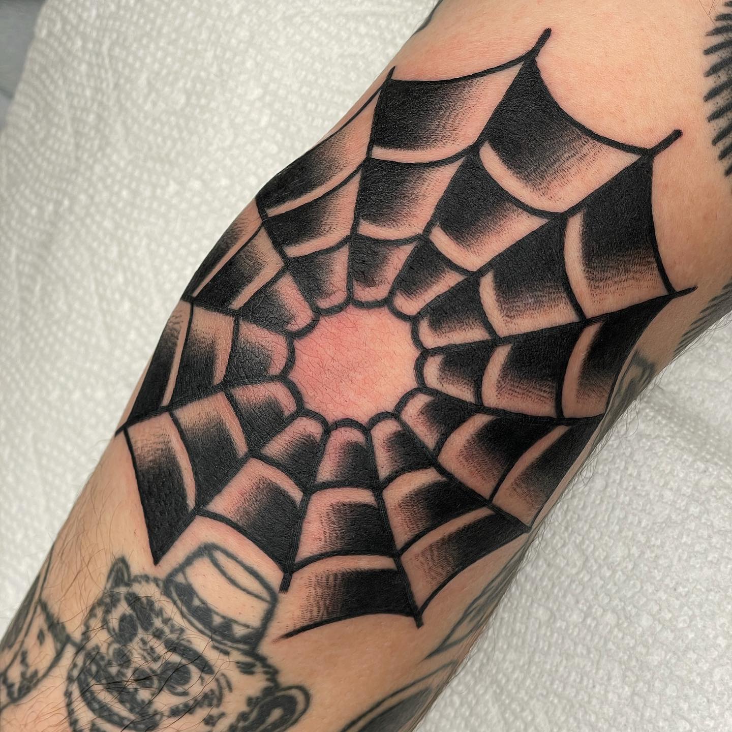 The tattoo features a detailed spider web that wraps around the elbow, showcasing bold black lines and shading.