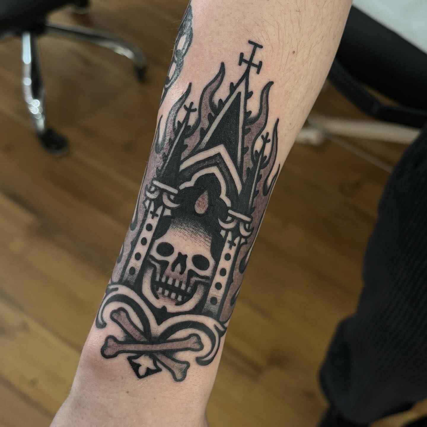 The tattoo features a striking skull framed by intricate gothic architecture, complete with pointed arches and flames.