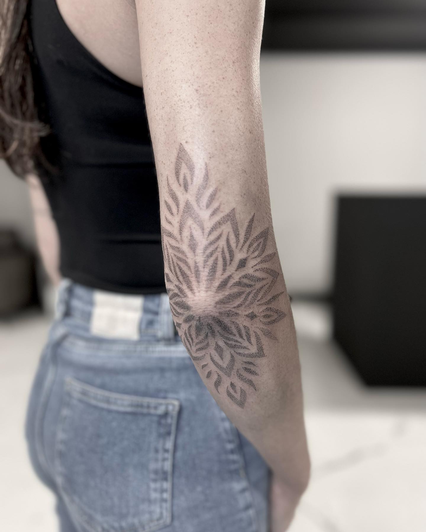 The tattoo features a detailed floral mandala that elegantly wraps around the elbow.