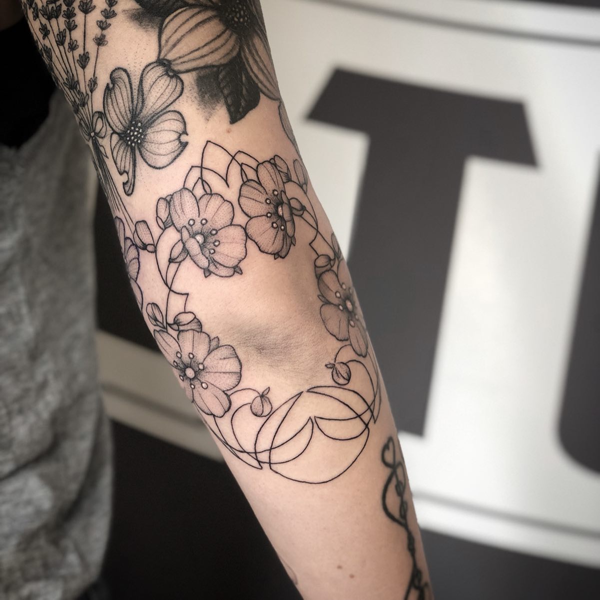 This design combines fine linework and floral details, enhancing the natural curves of the arm while allowing for movement.