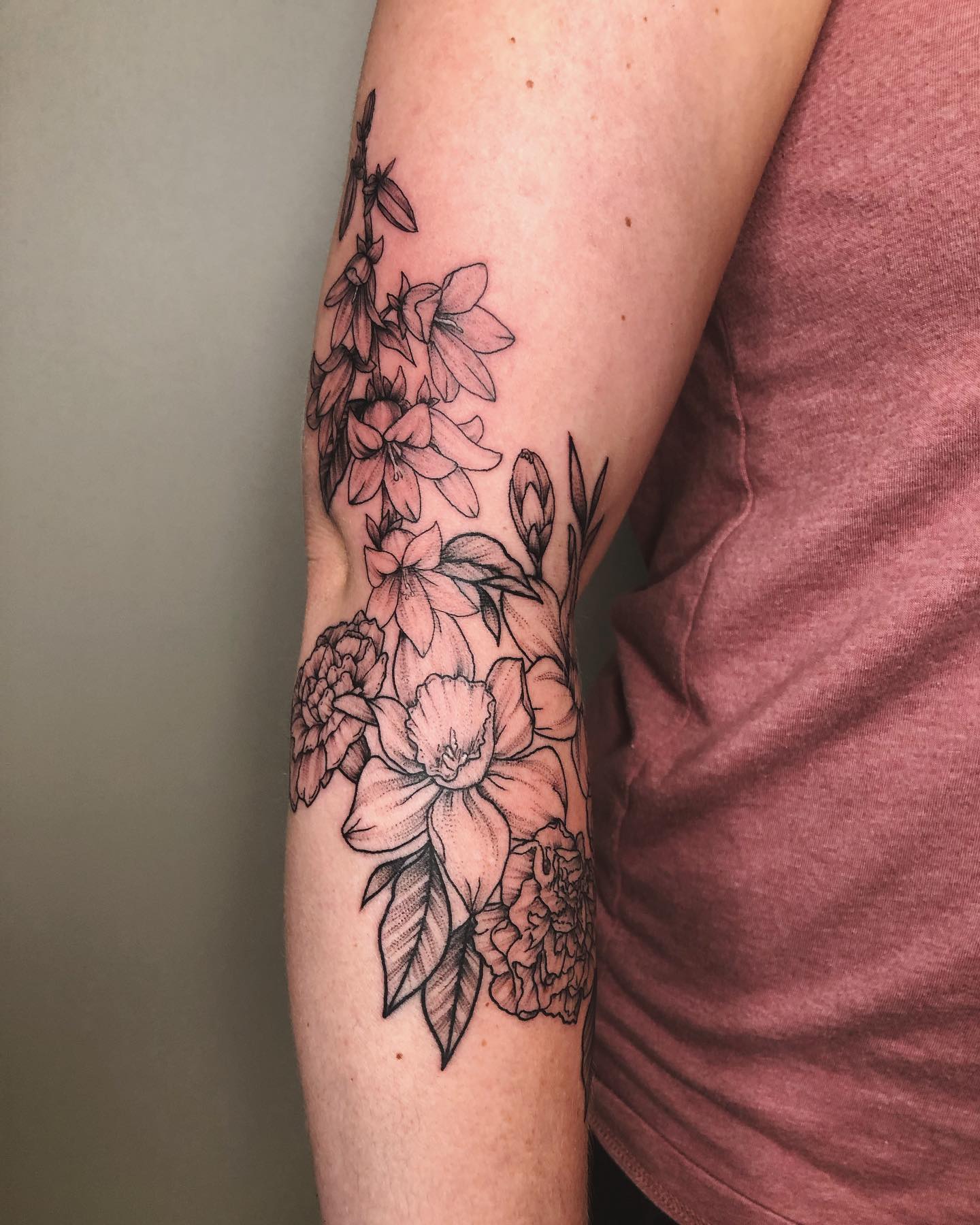 The tattoo features a detailed arrangement of various flowers that elegantly curves around the elbow.