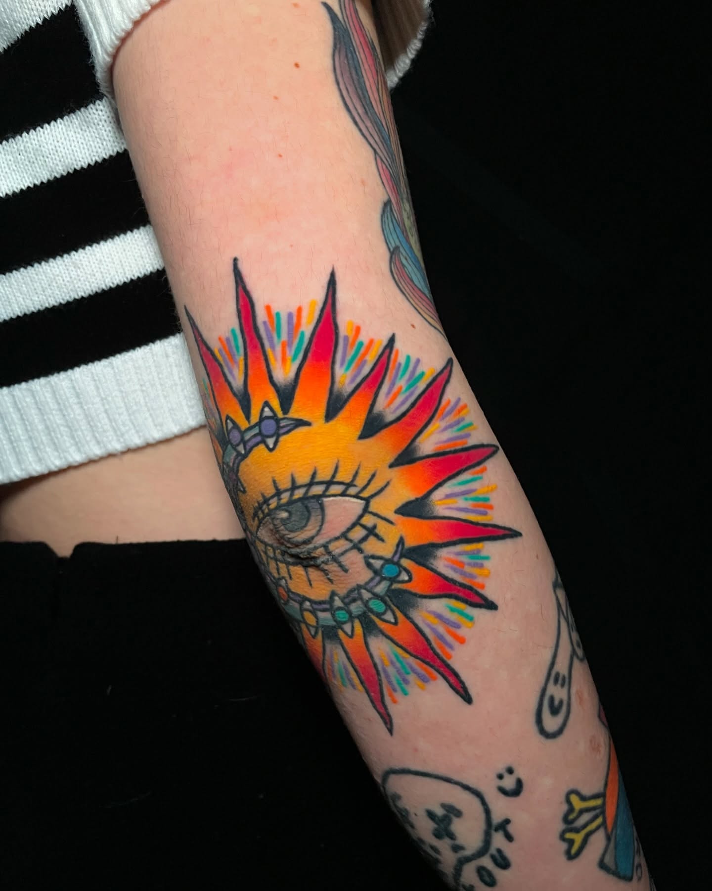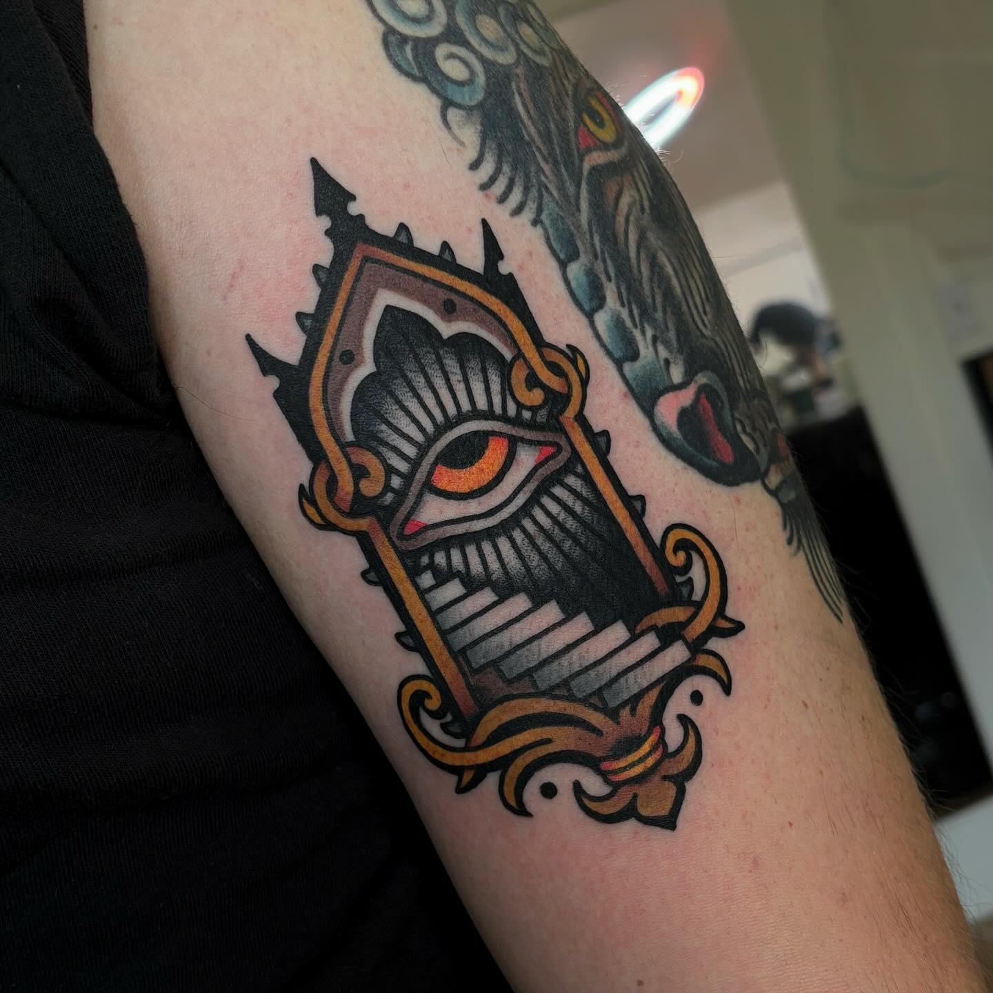 The tattoo features a striking eye enclosed in an ornate arch, combining bold lines and rich colors.