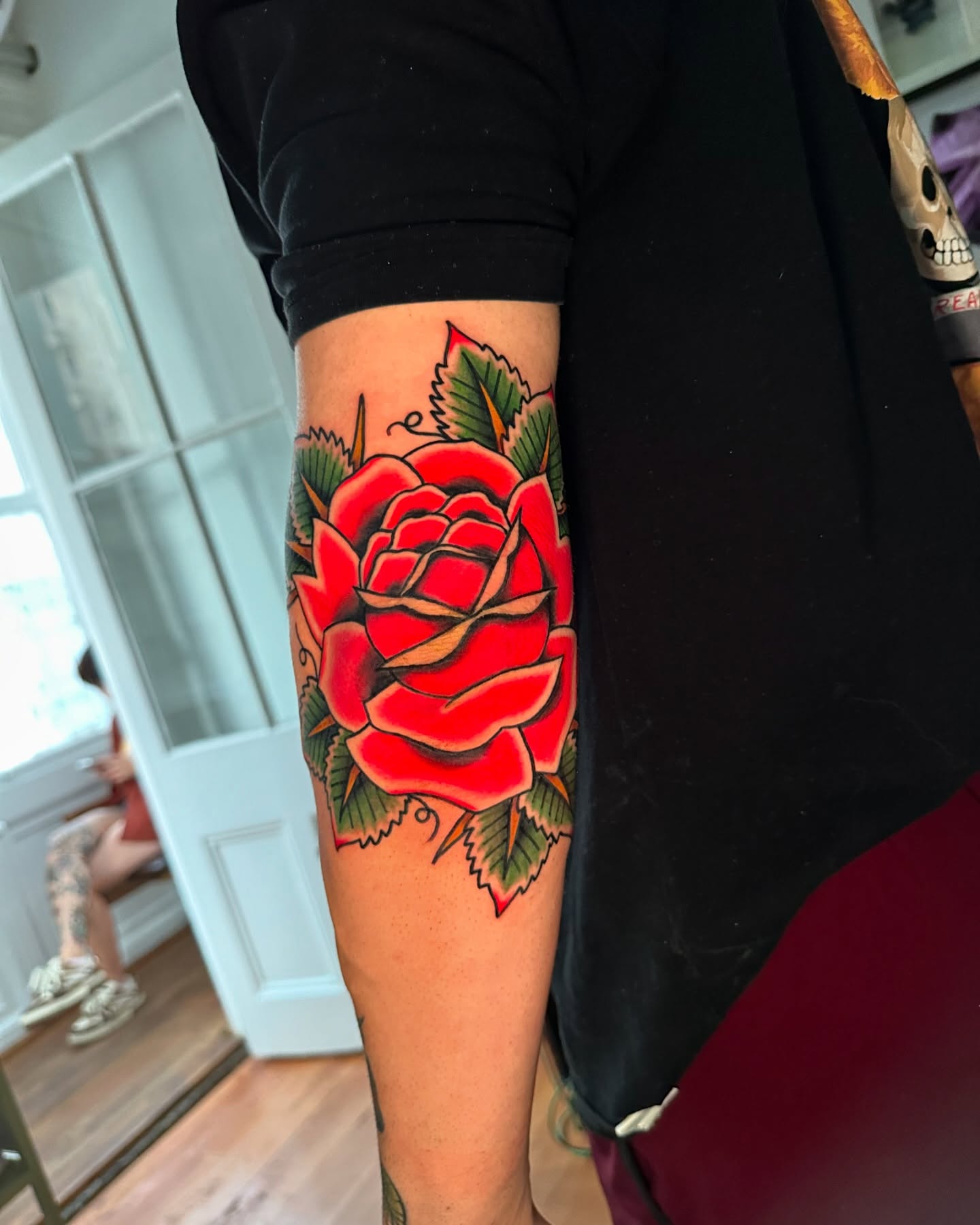 The tattoo features a large, vibrant red rose adorned with detailed green leaves.