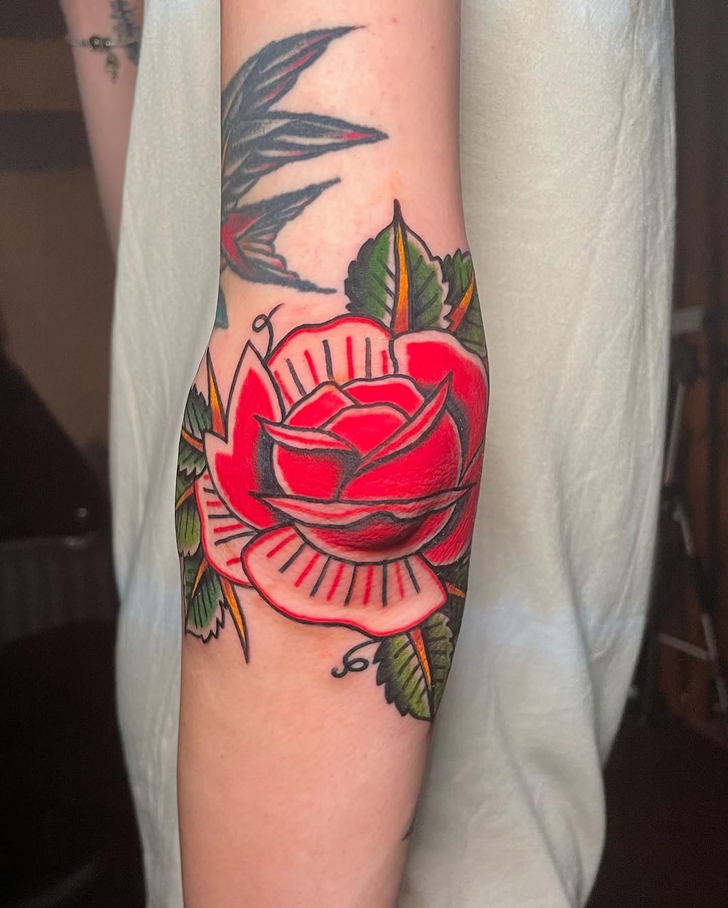 The elbow tattoo features a vibrant floral design that draws attention with its rich colors and intricate details.
