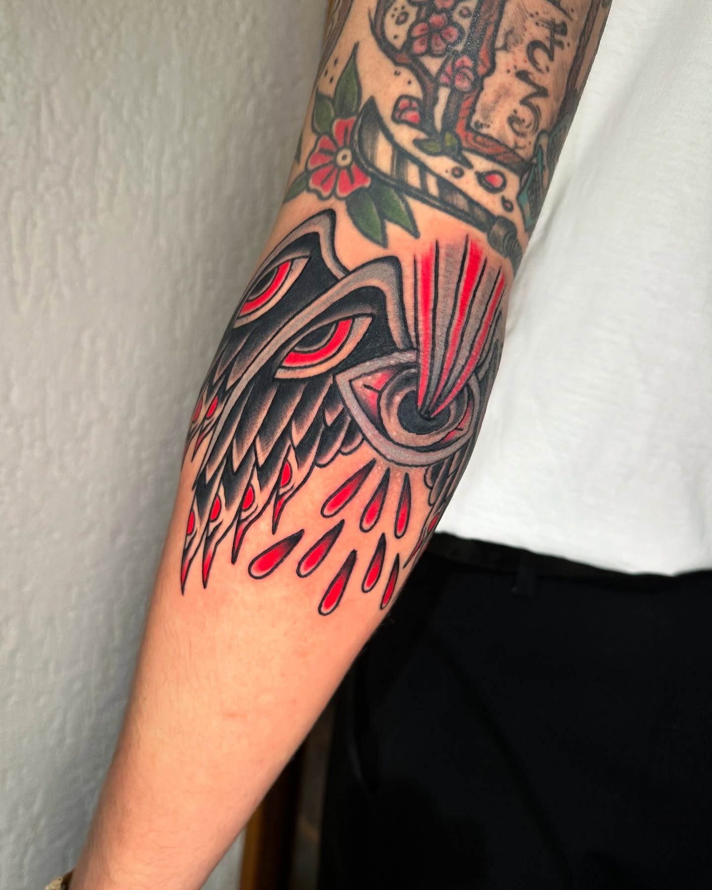 Bold black lines outline the design, while vibrant red drops flow from the owl, adding a dynamic contrast that captures attention.