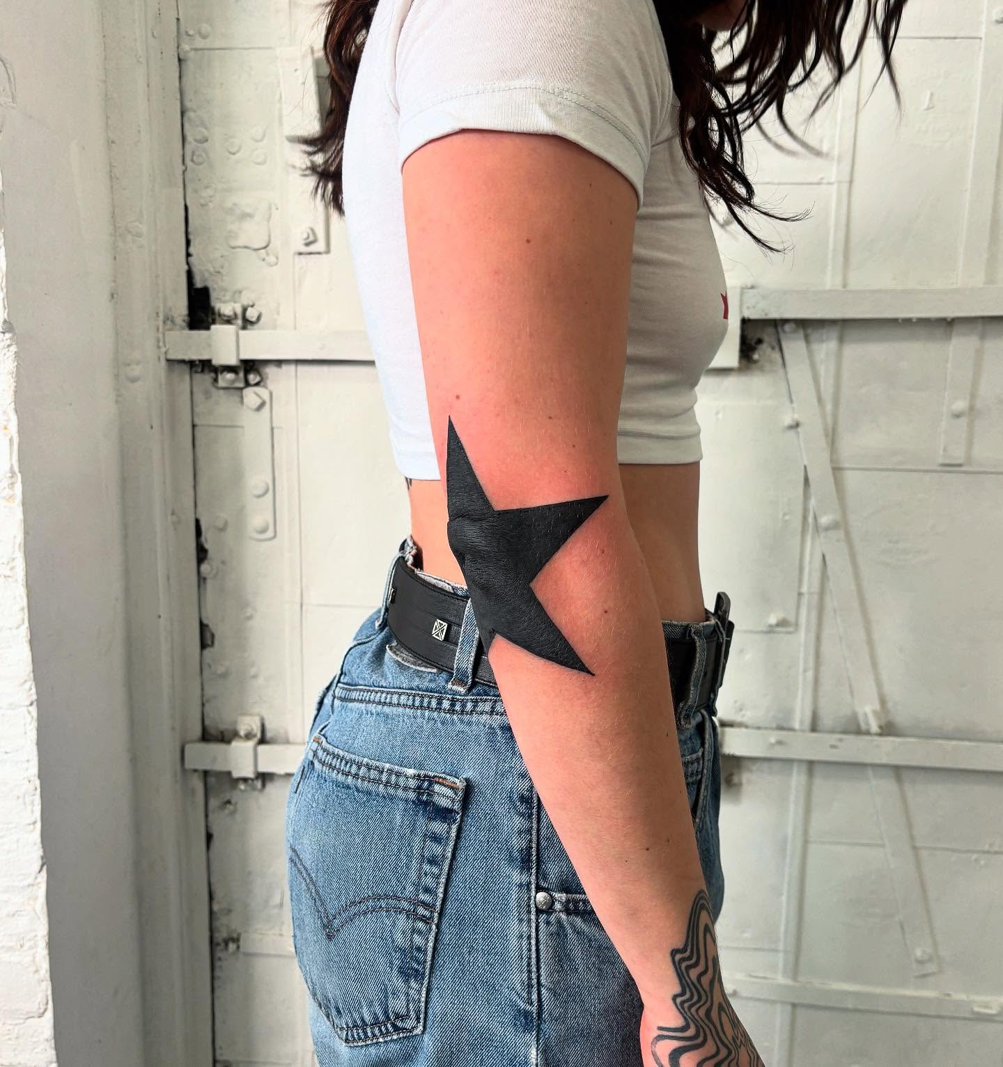 The tattoo features a large, solid black star that wraps around the elbow, creating a striking visual effect.