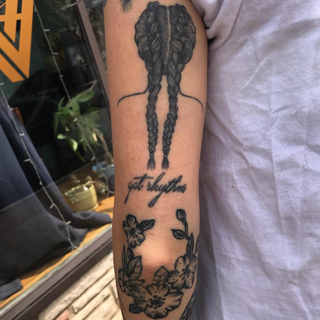 The tattoo features a detailed image of braided hair along with delicate floral designs.