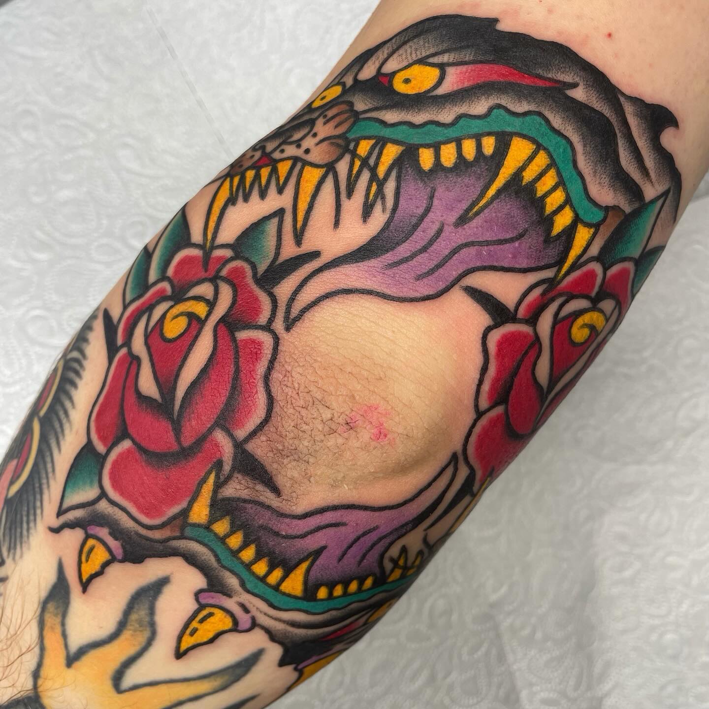 The intricate line work and bold colors combine to create a visually balanced piece that draws attention to the elbow area.