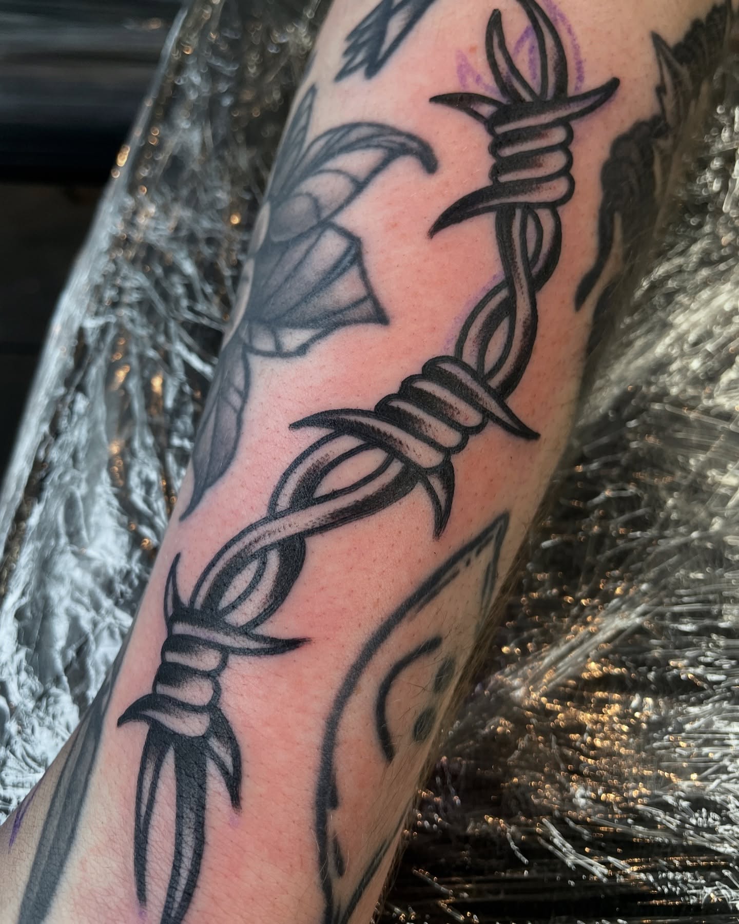 A striking leafy wreath design wraps around the elbow, featuring detailed black outlines and shading.