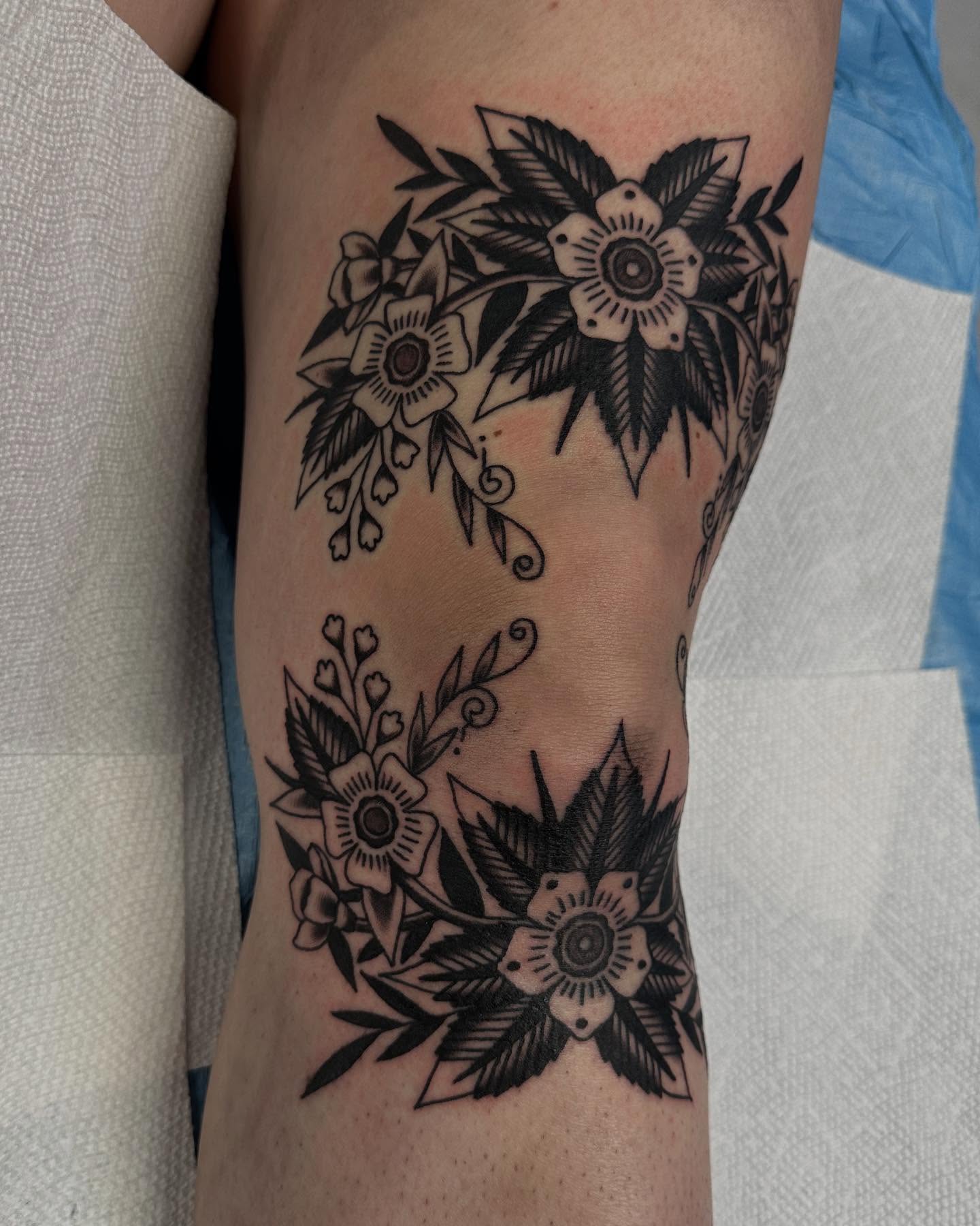 The tattoo features a bold floral design that wraps around the elbow, showcasing intricate flowers and leaves.