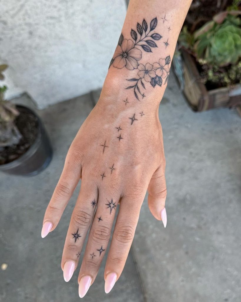 This delicate tattoo combines small blooming flowers on the wrist with tiny stars that trail down the hand and fingers, creating a whimsical, magical effect. The gentle floral and star elements make it feel like a night garden, adding a touch of beauty and mystery. Ideal for someone who loves a subtle, nature-inspired design.