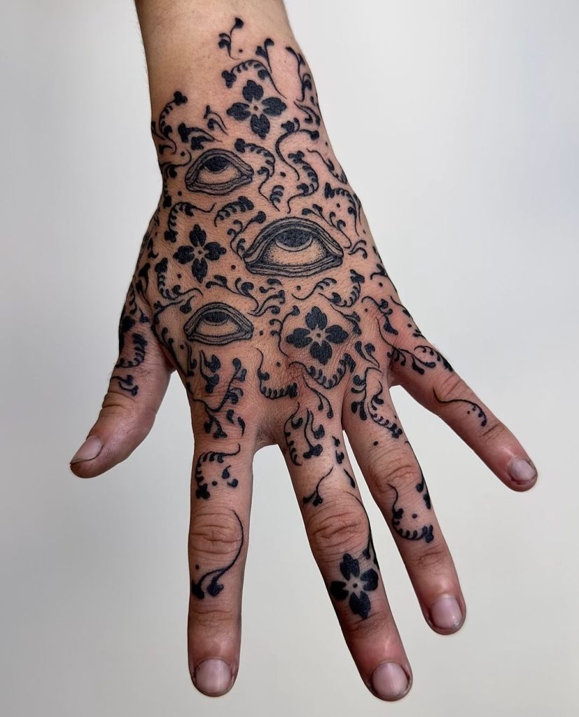 This tattoo showcases an intriguing pattern of multiple eyes surrounded by black, swirling floral designs, covering the back of the hand and extending onto the fingers. The dark, intricate details give it a hauntingly beautiful and mysterious vibe, as if the eyes are watching over and guarding secrets. It s a bold choice for anyone drawn to symbolic and protective imagery.