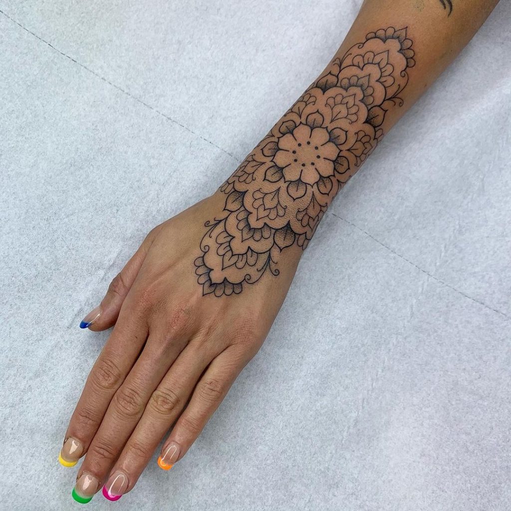 6. Intricate Mandala Flower Tattoo on Hand and Wrist
