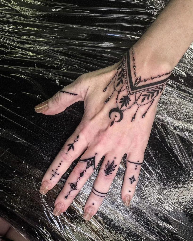 This tattoo resembles an elegant hand chain with decorative beads, leaves, and dangling charms, including a crescent moon and teardrop shapes. The design wraps gracefully around the wrist and fingers, with intricate symbols and geometric patterns adorning each finger, adding a mystical, bohemian feel. Perfect for someone who loves spiritual, jewelry-inspired tattoos with an ethereal vibe.
