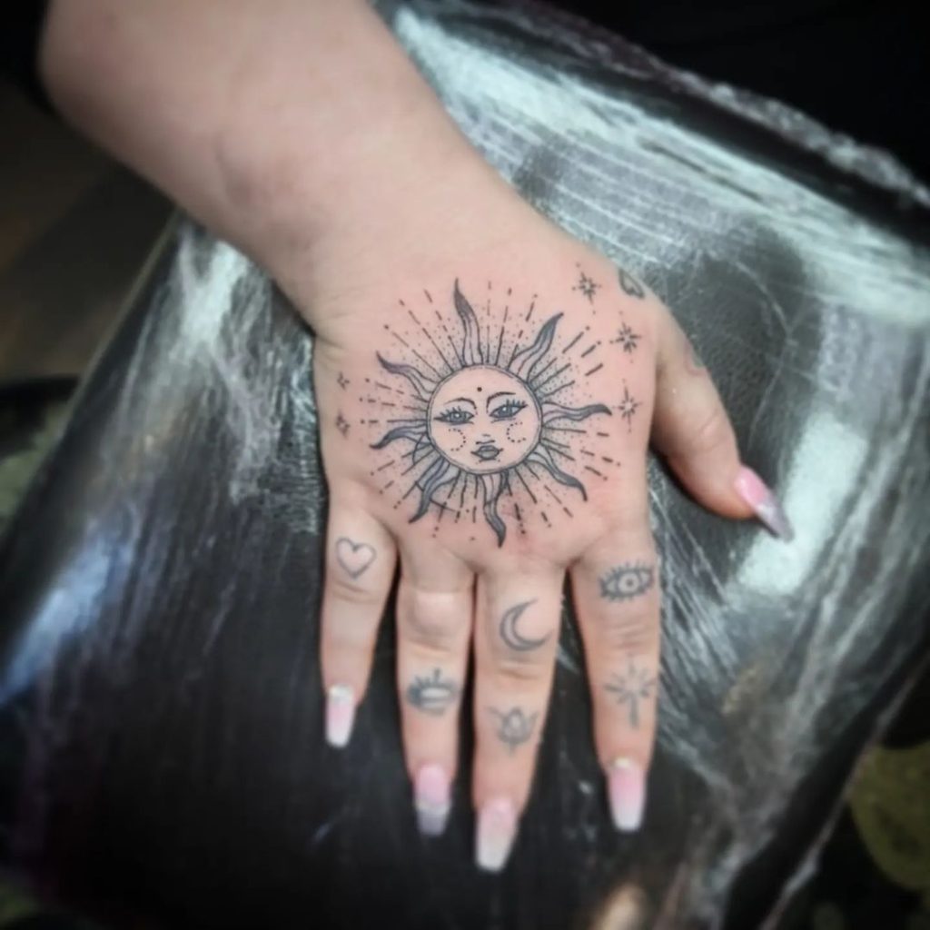 This tattoo features a mystical sun with a serene face at the center of the hand, surrounded by radiating lines and small stars. The fingers are adorned with symbols like a heart, crescent moon, lotus, and an eye, adding to the celestial theme. It s perfect for someone drawn to cosmic and spiritual imagery.
