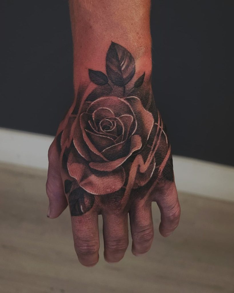 This tattoo showcases a beautifully detailed rose in dark, rich shading, covering the back of the hand. The intricate petals and deep shadows give the rose a realistic, three-dimensional look, creating a bold and dramatic effect. Perfect for someone who appreciates classic floral designs with a striking, artistic style.