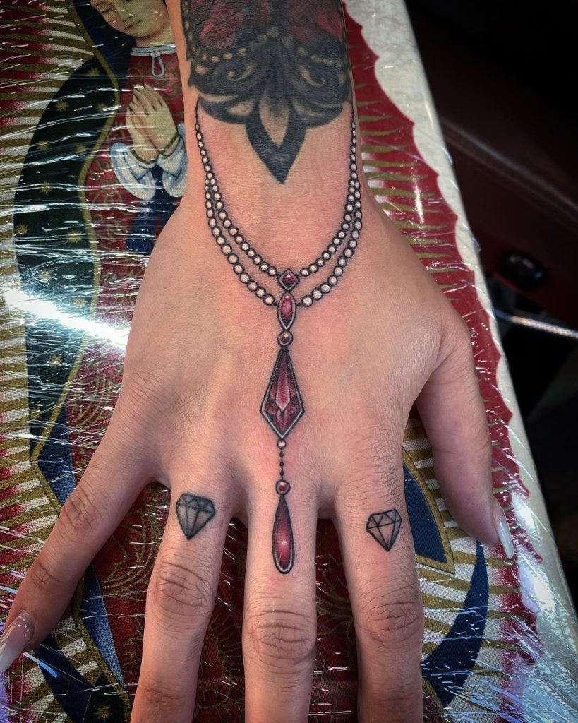 15. Elegant Red Gem Necklace Tattoo on Hand