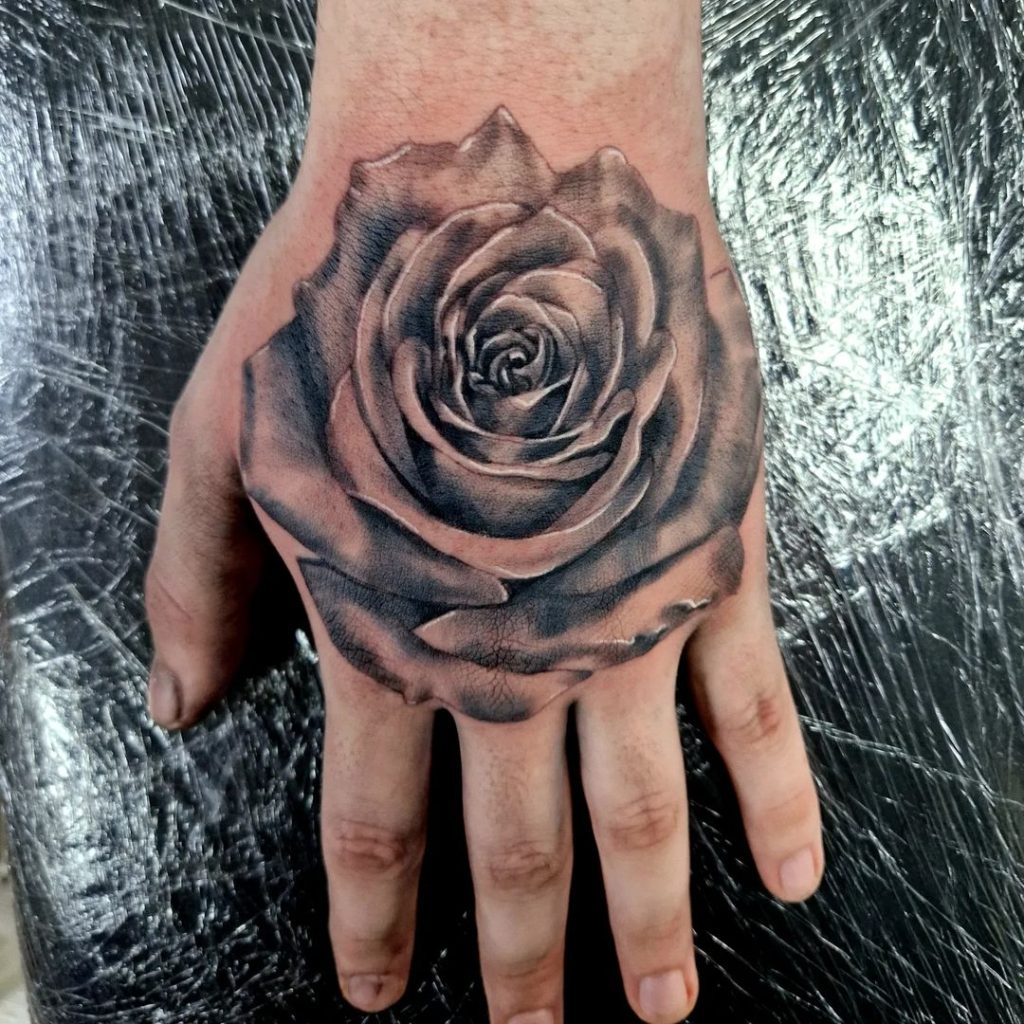 39. Realistic Black and Gray Rose Tattoo on Hand