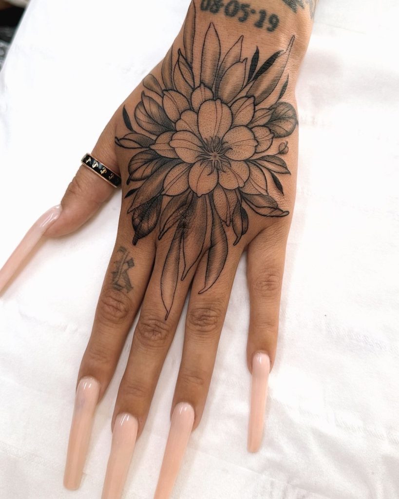 This tattoo showcases a large, beautifully detailed flower with layered petals that spreads across the back of the hand. The delicate lines and shading give the flower a soft, natural look, adding elegance and femininity to the design. It s a perfect choice for someone who wants to carry a bit of nature s beauty with them.