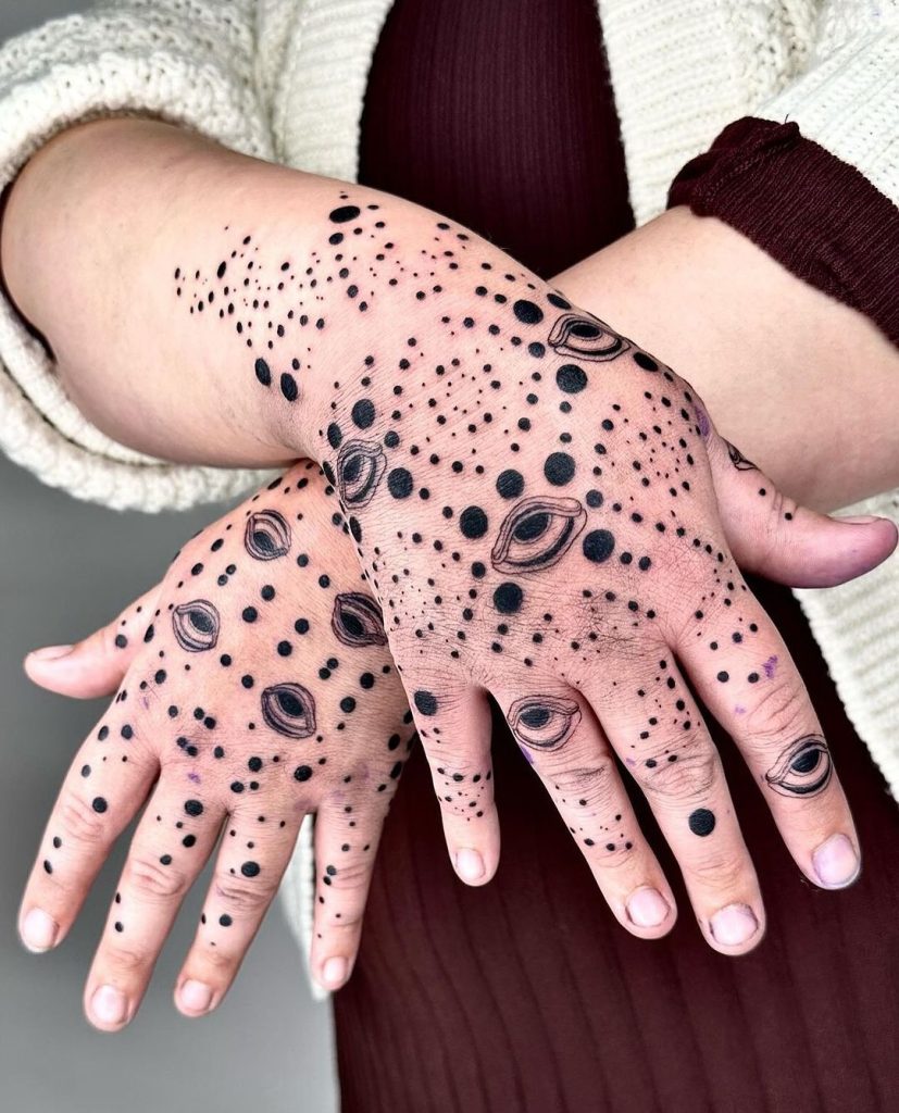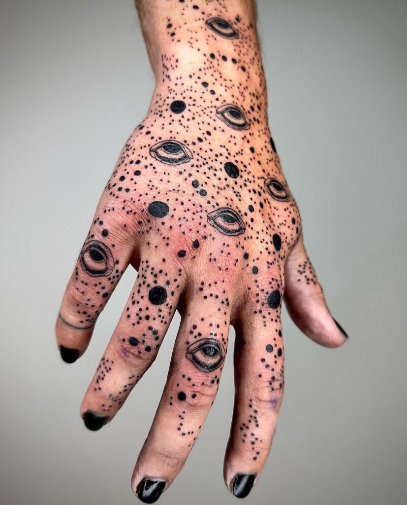 This tattoo design spreads across both hands with scattered black dots of varying sizes, creating a galaxy-like effect. Mysterious eyes are placed throughout the pattern, peeking out in different directions, adding a surreal and otherworldly feel. This cosmic arrangement of eyes and dots gives the hands a magical, watchful presence.