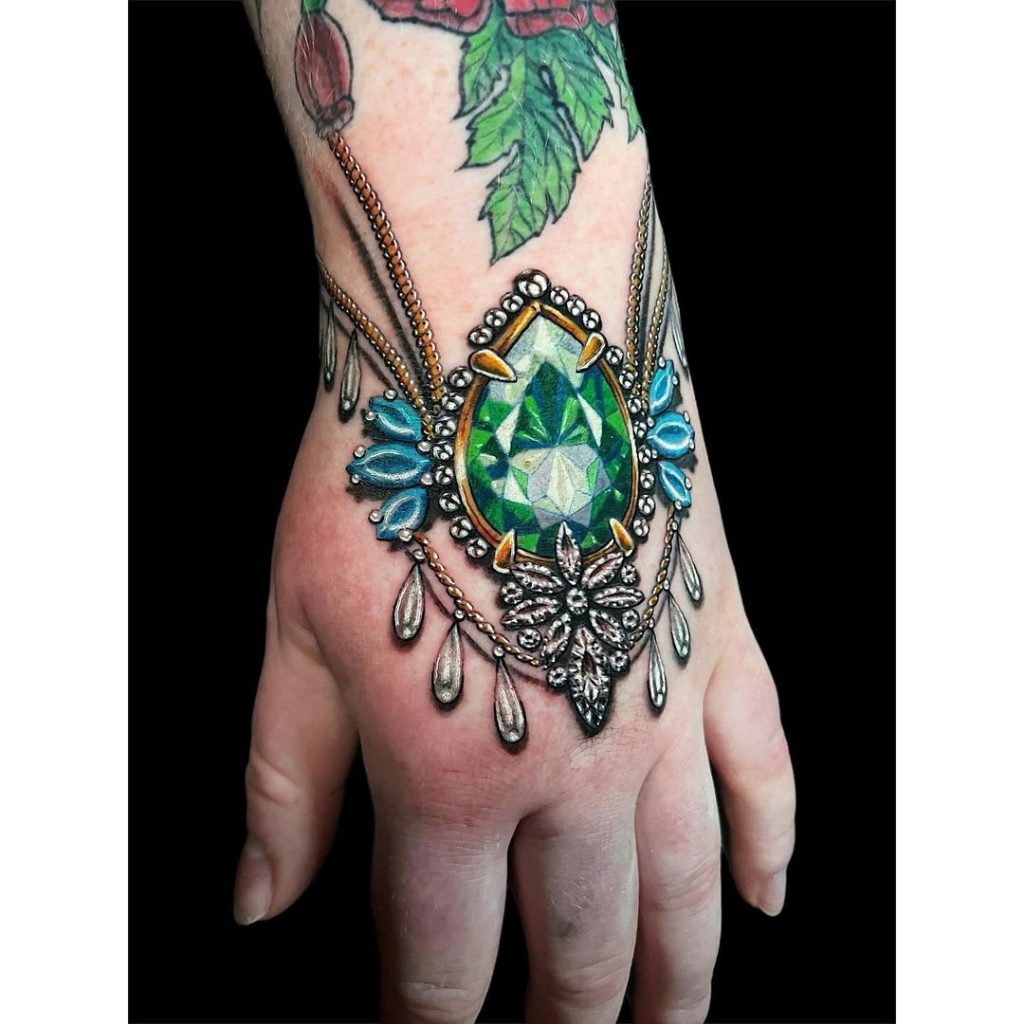 This tattoo looks like an elegant piece of jewelry, with a large, lifelike green gemstone at the center, surrounded by intricate silver and blue details, chains, and shimmering drops. The design s realistic shading makes it appear almost three-dimensional, as if a royal pendant is resting on the hand. It s perfect for someone who loves a luxurious, eye-catching look.