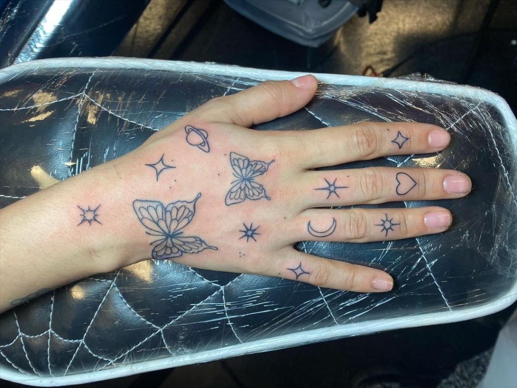 This tattoo combines delicate butterflies with celestial symbols like stars, a crescent moon, and a small planet, scattered across the hand and fingers. Each element is simple yet charming, creating a whimsical, dreamy look. Ideal for someone who loves both the beauty of nature and the magic of the cosmos.