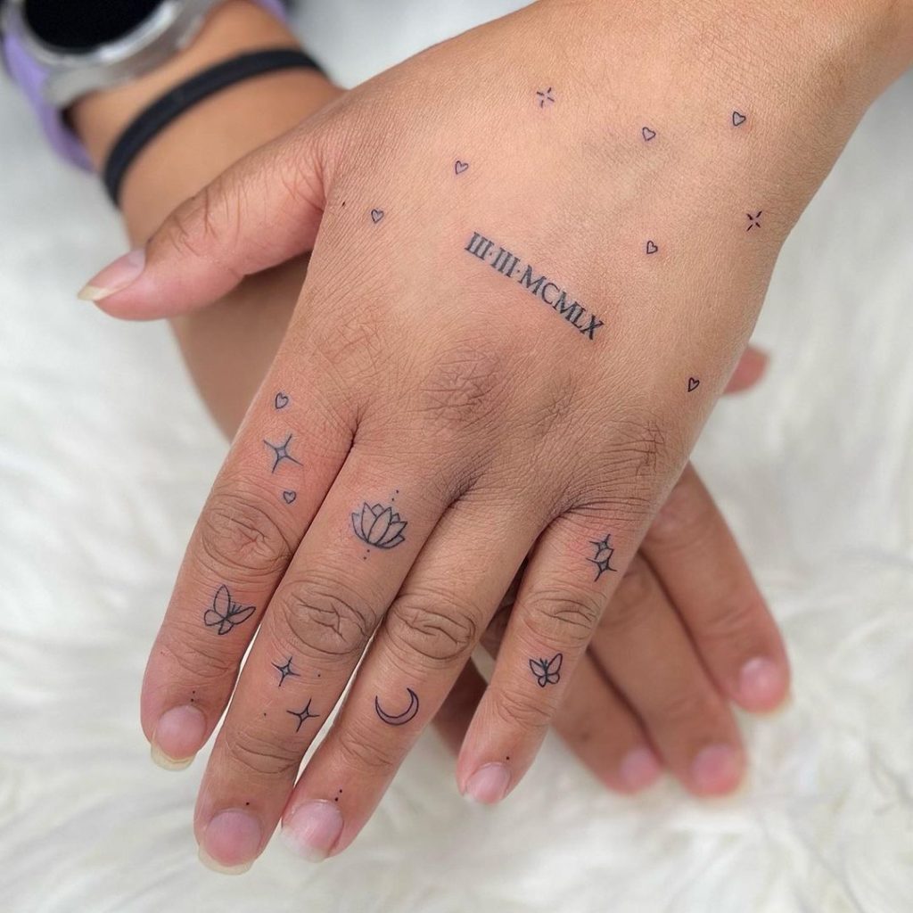 This tattoo features a delicate mix of small symbols like stars, hearts, butterflies, and a lotus flower scattered across the fingers and back of the hand. A meaningful Roman numeral date is centered above the knuckles, adding a personal touch to the playful design. Perfect for someone who loves simple, meaningful details with a whimsical vibe.