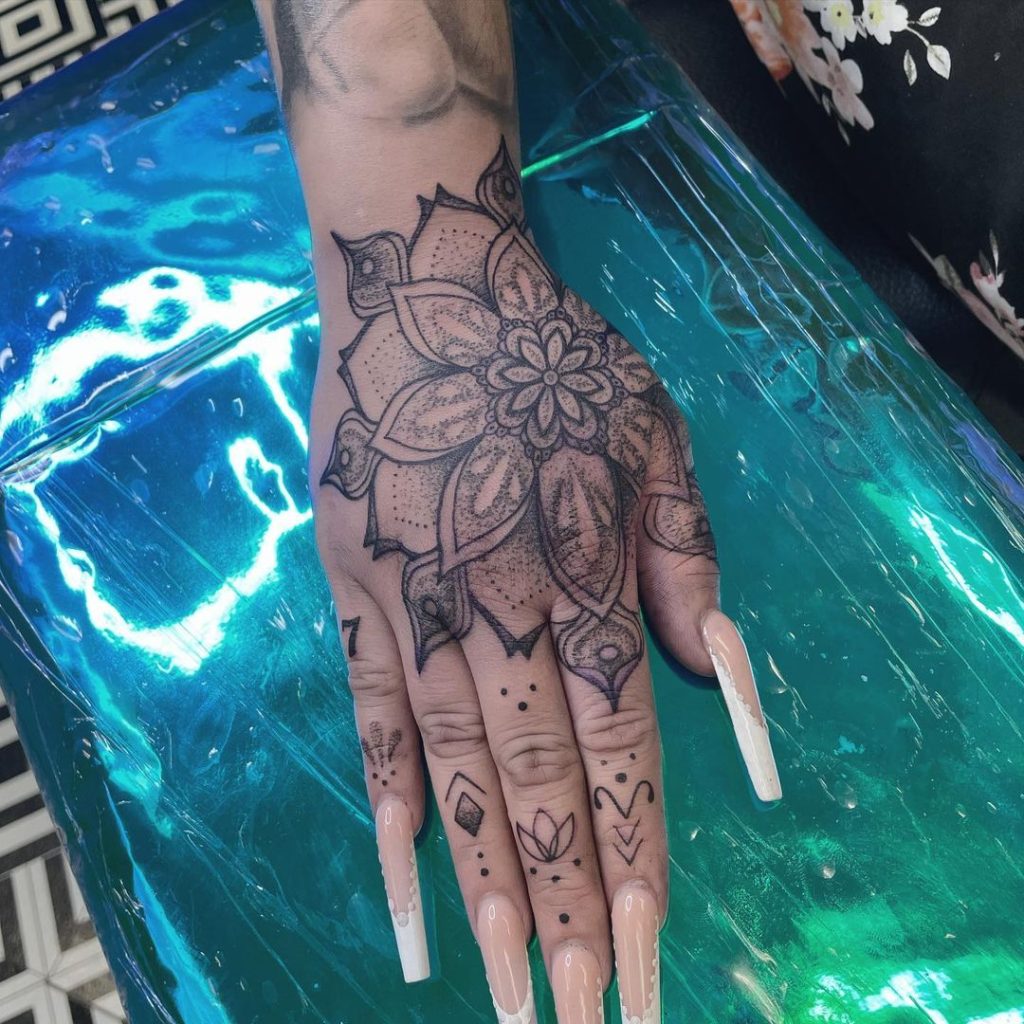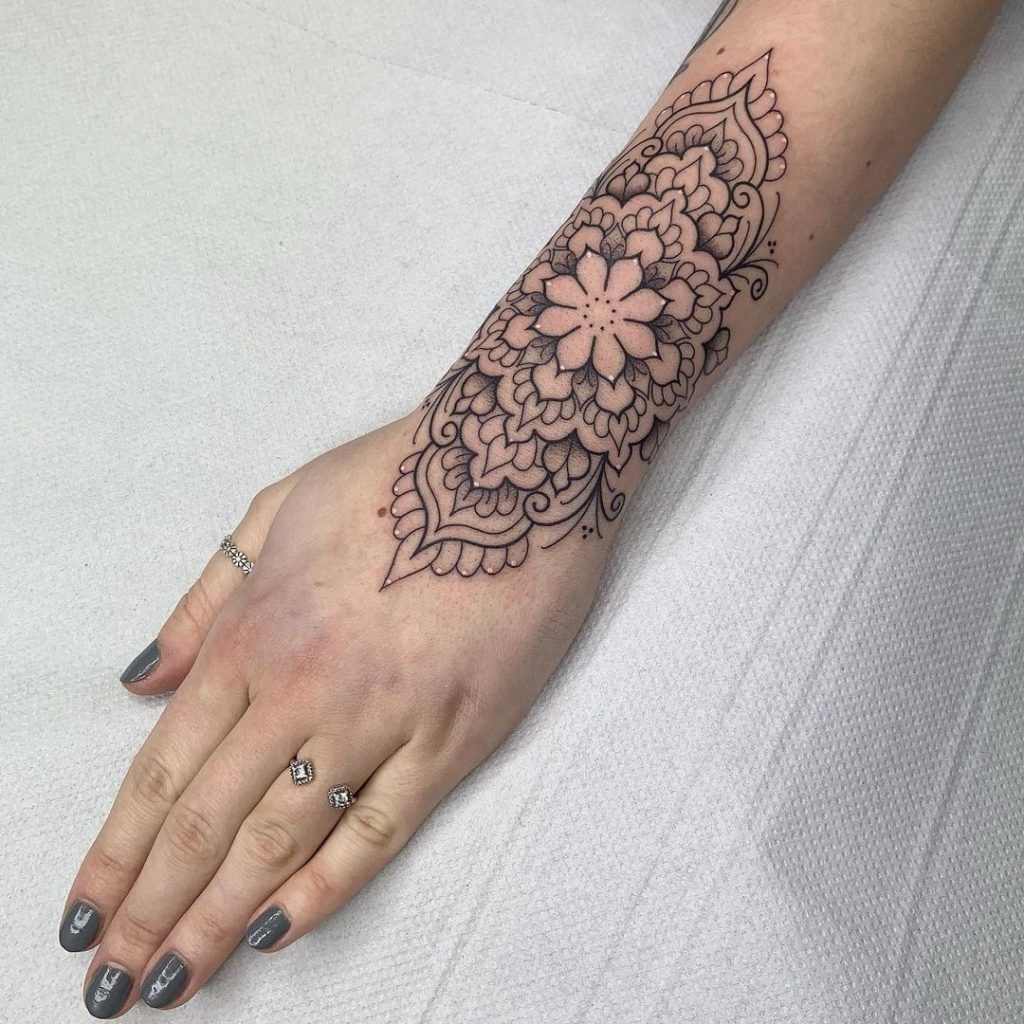 This tattoo features an elaborate mandala pattern that starts on the wrist and flows onto the hand, with a central flower surrounded by symmetrical petals and swirling details. The fine lines and layered design give it a mesmerizing, lace-like appearance, perfect for someone who loves intricate and balanced artwork.