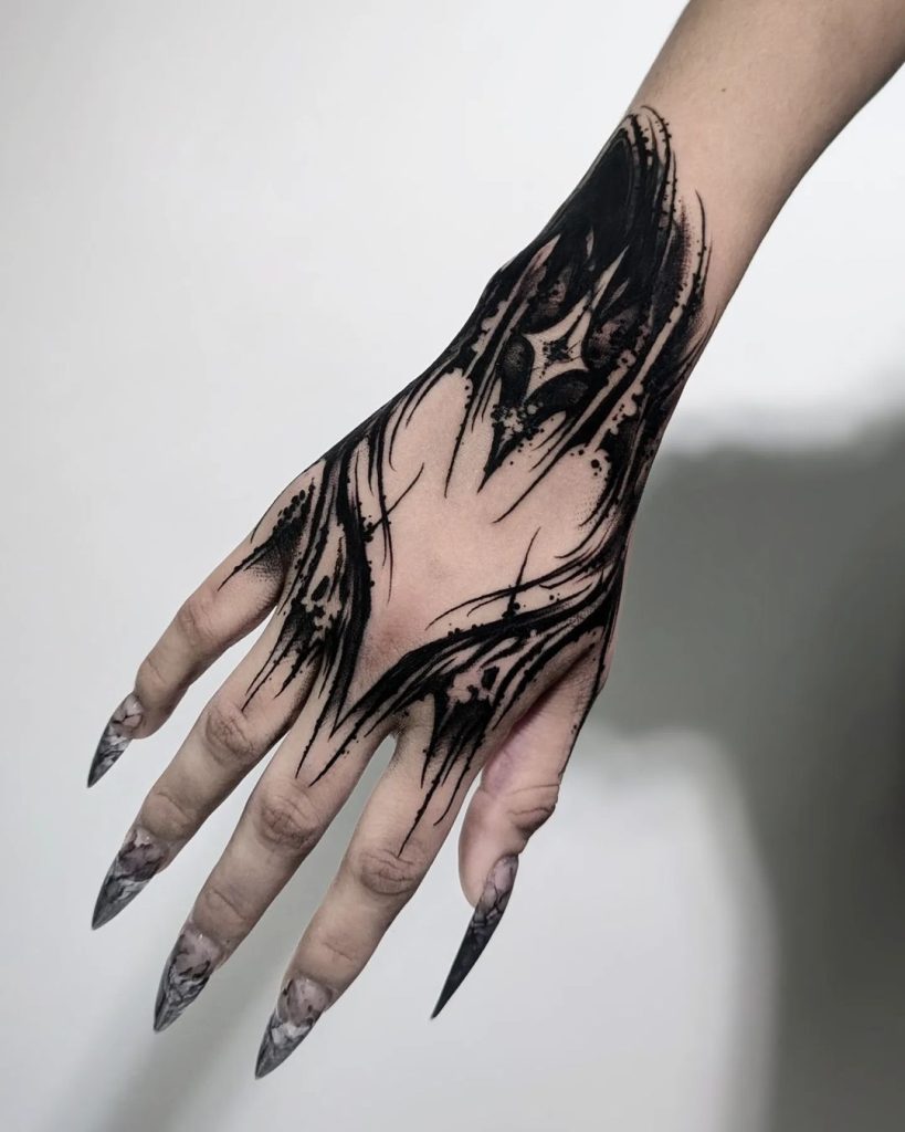 This bold tattoo features intense, abstract black ink patterns that stretch across the hand, creating a sharp, claw-like effect. The jagged strokes and dark shading give it a dramatic, otherworldly look, perfect for someone with a fierce, alternative style. The design feels powerful and adds a sense of mystery and intensity to the hand.