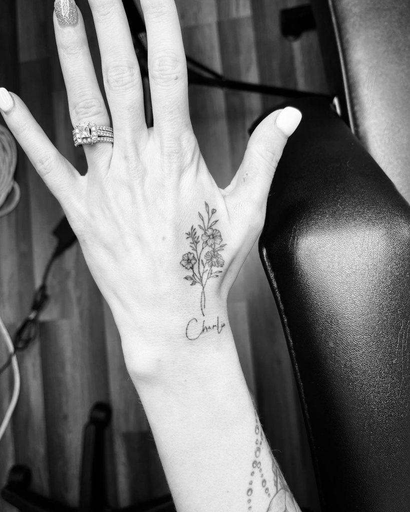This tattoo features a simple, elegant bouquet of wildflowers on the side of the wrist, with fine lines capturing each petal and leaf in soft detail. Below the flowers, the name “Charli” is written in a gentle script, adding a personal touch to the design. Perfect for someone who wants a subtle, meaningful tribute to a loved one.