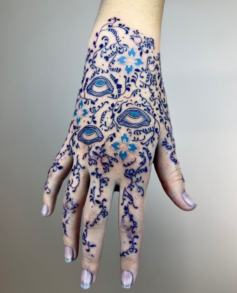 This hand tattoo features multiple mysterious eyes, surrounded by intricate blue and dark blue filigree patterns that cover the hand in a lace-like design. The swirling patterns and delicate blue accents give it a mystical and elegant look, like something out of a fantasy story. This tattoo is perfect for someone who loves unique, eye-catching designs with a magical touch.