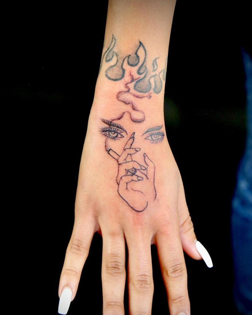 This unique tattoo design features a minimalistic face, drawn with fine lines, where expressive eyes peek through a hand gesture, creating a mysterious vibe. Above the face, stylized flames rise up the wrist, adding a bold touch to the delicate linework. This piece is perfect for someone who loves edgy yet artistic tattoos with a bit of attitude.