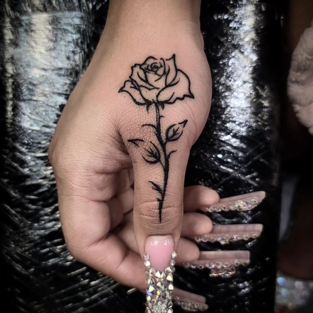 This tattoo features a delicate, single-stemmed rose in bloom, placed gracefully along the side of the thumb. The simple black linework highlights the rose s petals and leaves, giving it a timeless, classic look. Perfect for someone who appreciates subtle beauty and elegance in a compact design.