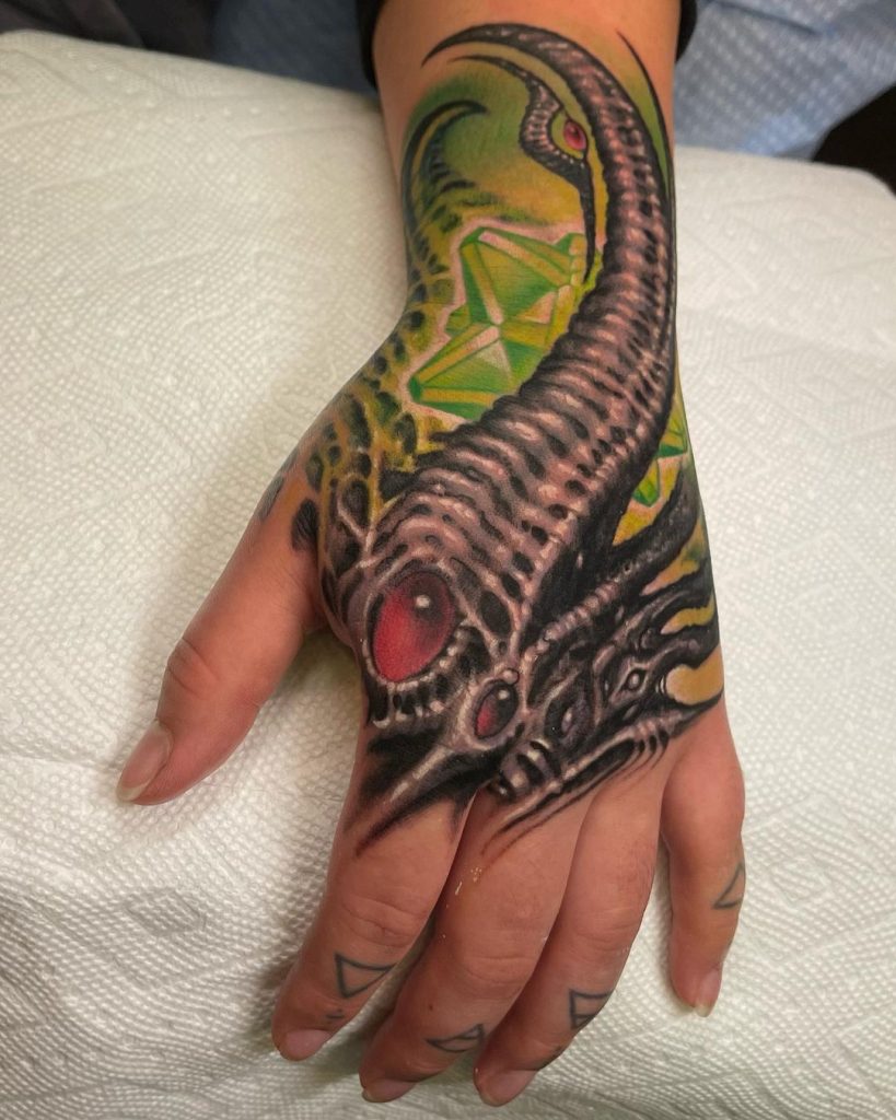This tattoo features a surreal, otherworldly creature with a textured, claw-like form and vibrant red eyes, stretching across the back of the hand. The intricate details, bold shading, and neon green background create a dynamic, 3D effect, giving it an intense, sci-fi vibe. Perfect for someone who loves unique, futuristic designs with a mysterious edge.