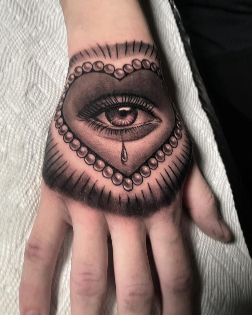 This striking tattoo depicts a realistic eye enclosed within a heart shape, adorned with a pearl-like beaded border. A single teardrop falls from the eye, adding an emotional, surreal touch to the design. The detailed shading gives the piece a three-dimensional effect, perfect for someone who appreciates symbolic and visually impactful tattoos.