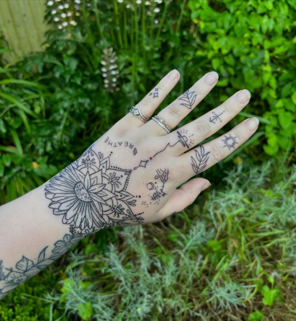 20. Whimsical Floral and Nature Tattoo on Hand and Fingers