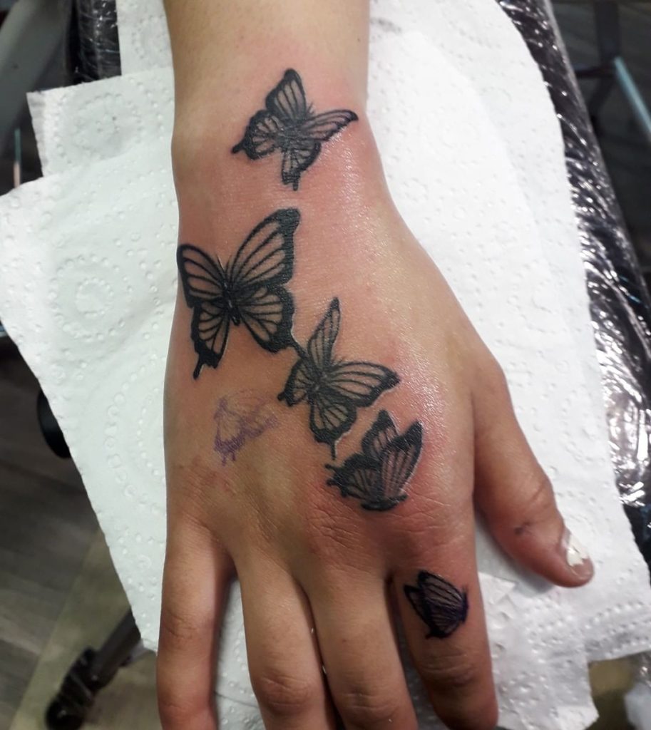 This tattoo features a graceful trail of butterflies in flight, spreading across the back of the hand and down onto the finger. The butterflies vary in size and position, creating a dynamic, lively effect as if they re fluttering up the hand. Perfect for someone who loves the symbolism of freedom and transformation.