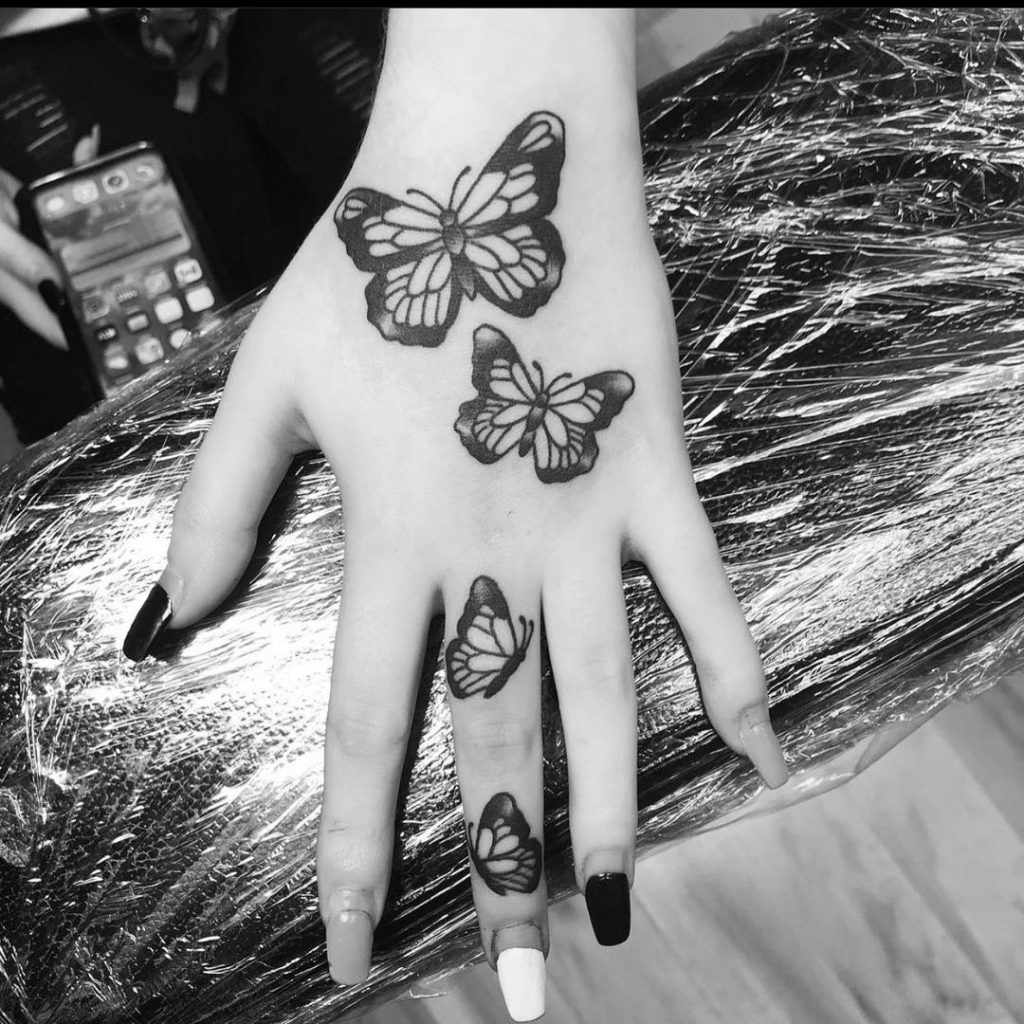30. Bold Butterfly Tattoo Trio on Hand and Fingers